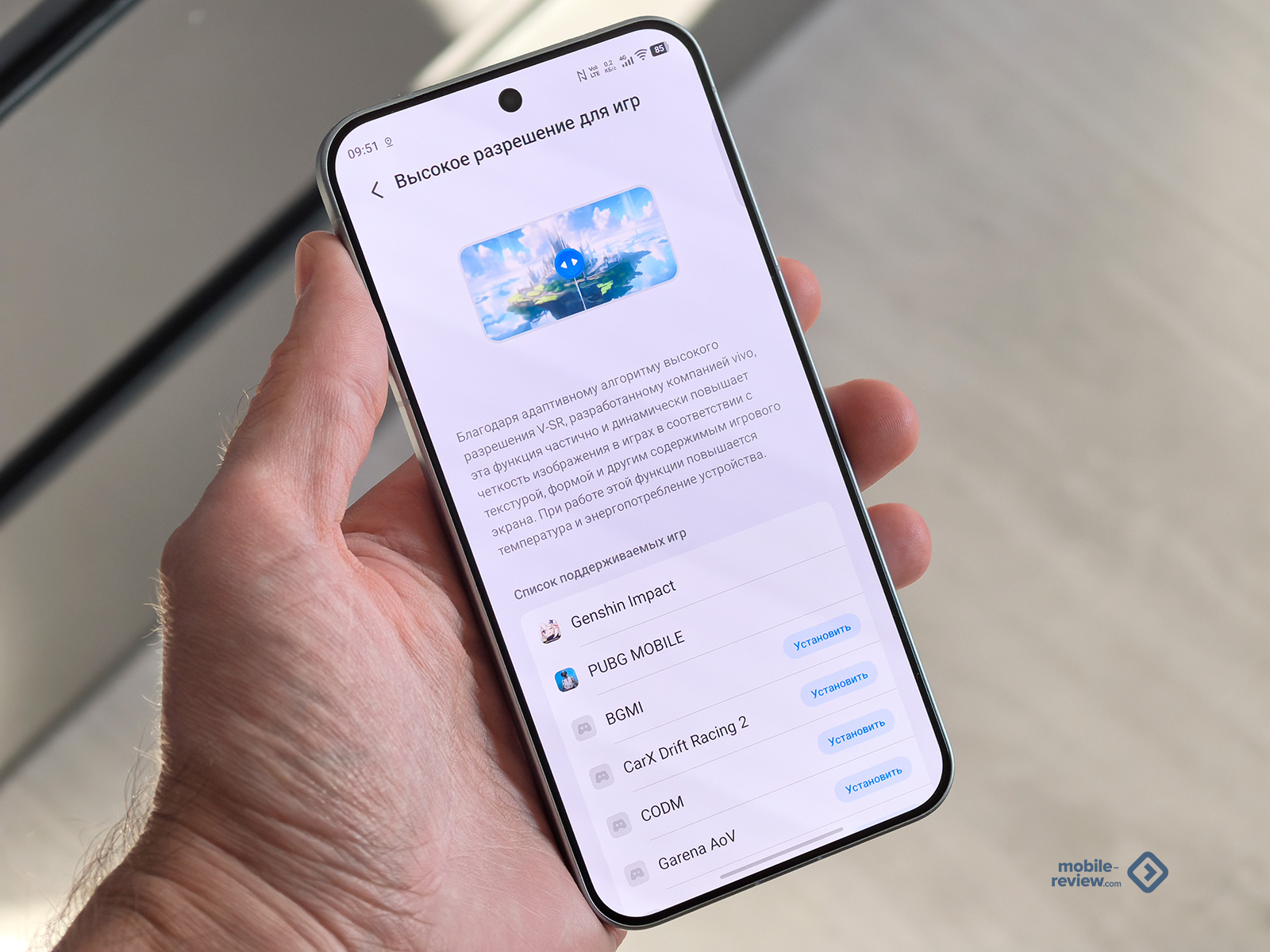 Однако секретное оружие vivo — это ультраигровой режим. Обычно игровые режимы в смартфонах — это фикция. Запускаешь, тебе счетчик показывает повышенную частоту кадров, а по ощущениям ничего не меняется. У vivo игровой режим выстроен иначе. Компания адаптировала смартфон под небольшой список (всего 12 позиций) самых популярных игр. По сути, для этих игр vivo сделала аналог DLSS от Nvidia, то есть vivo X300 повышает разрешение текстур, умеет увеличивать частоту кадров и детализацию картинки. И главное, что все эти изменения сразу заметны.