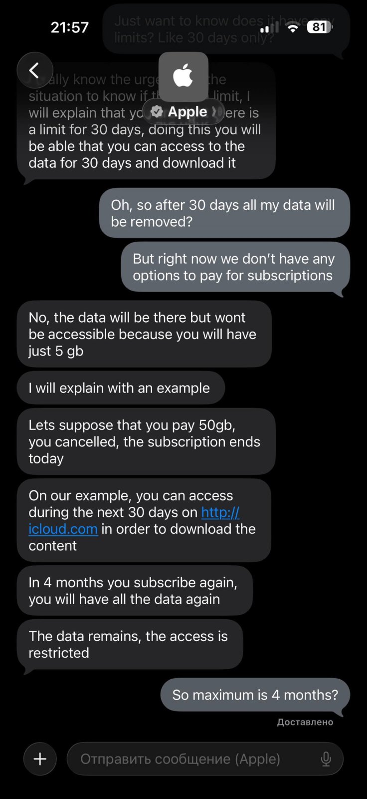 Для уточнения мы направили запрос через iMessage в службу поддержки Apple. Получив ответ, мы поняли, что для компании случай стал прецедентным и они внутри еще не наладили все процессы, а также не довели информацию до всех линий саппорта.