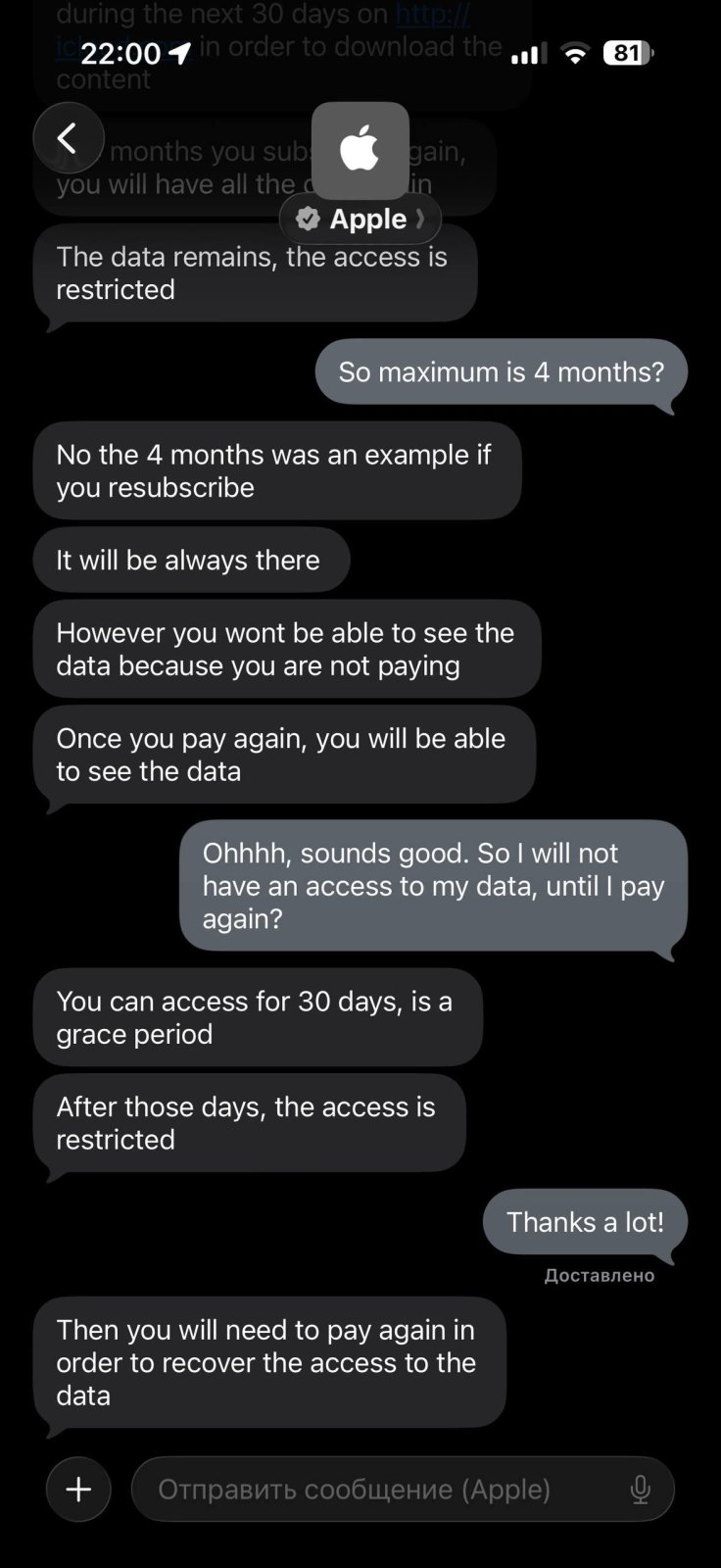 Однако некоторые издания получили в поддержке другую информацию, где сотрудники заявляли, что доступ к данным останется без ограничений. Это еще раз подтверждает мой вывод, что внутри Apple решения относительно российских аккаунтов еще не консолидированы. Поэтому лучше дождаться дополнительных уточнений от компании, а также не будет лишним сделать резервную копию своих файлов, если в ближайшем будущем вы не планируете продлевать подписку iCloud+.