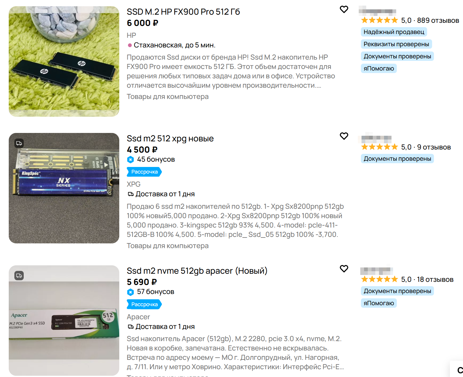 Я думаю, именно поэтому в России расцвел такой дикий и, наверное, неизбежный тренд: народ массово ломанулся на вторичку. Продажи бэушных SSD на «Авито» взлетели в пять с половиной раз. Довольно показательная цифра, которая говорит о том, что официальная розница стала для многих просто неподъемной. Средняя стоимость SSD на барахолке держится в районе 4 000 – 5 000 рублей (за 512 ГБ), в то время как в ретейле аналогичные модели улетают уже за 7 000 – 8 000 рублей.