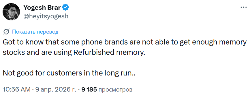 По смартфонам и ноутбукам ситуация чуть иная, но вывод схожий. Китайские производители уже предупредили о росте закупочных цен на 10-30%. Например, президент Xiaomi Лу Вейбинг в начале апреля 2026 года официально подтвердил в китайской соцсети Weibo, что стоимость памяти для смартфонов выросла почти в 4 раза по сравнению с первым кварталом 2025 года. В той же социальной сети отрапортовал и товарищ Линь Линь, вице-президент и глава подразделения Honor Smart Life: