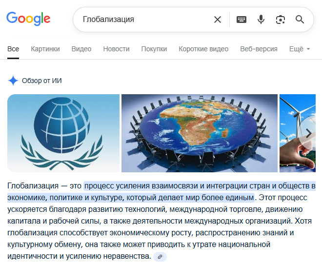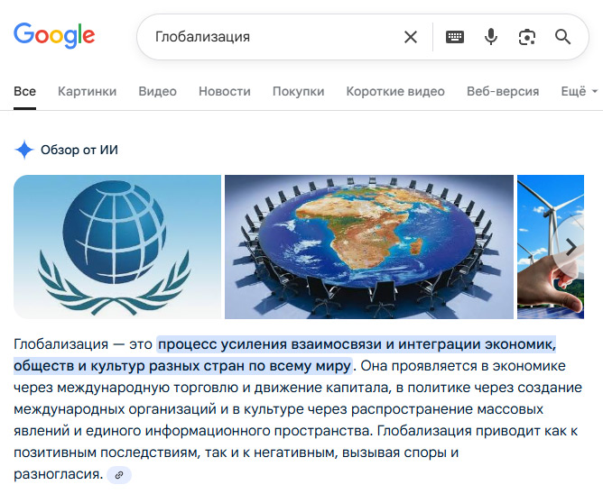Выше вы можете видеть краткую выдержку от ИИ о том, что такое глобализация. Что это такое, мы все знаем. По крайней мере, своими словами точно расскажем. Положительные стороны так вообще видно невооруженным глазом. Вот так, например, глобализация иллюстрируется в «Википедии»: