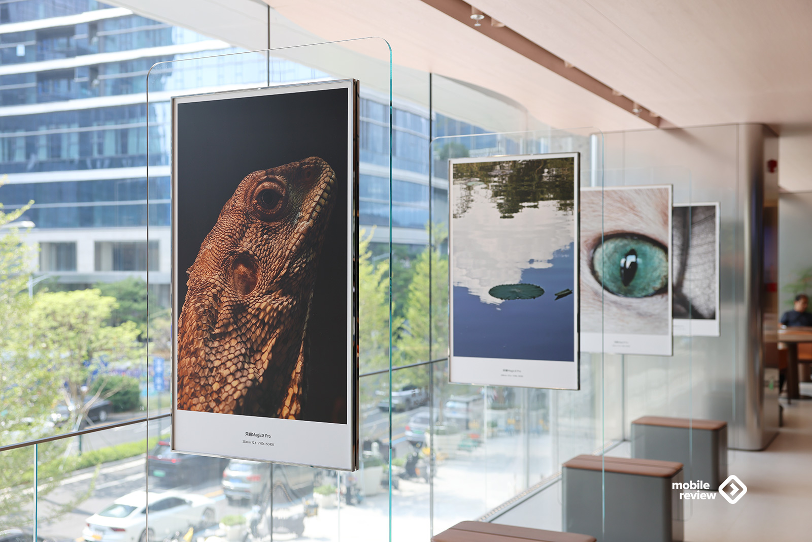 У окон разместили небольшие фотостенды, показывающие, как снимают телефоны компании.