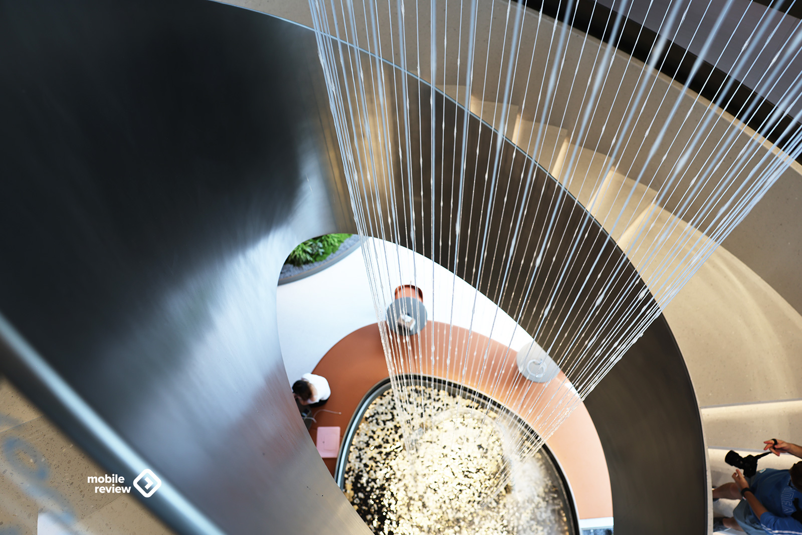Проходим до конца торгового зала, тут винтовая лестница, посередине льются струи воды, она падает вниз и немного шумит.