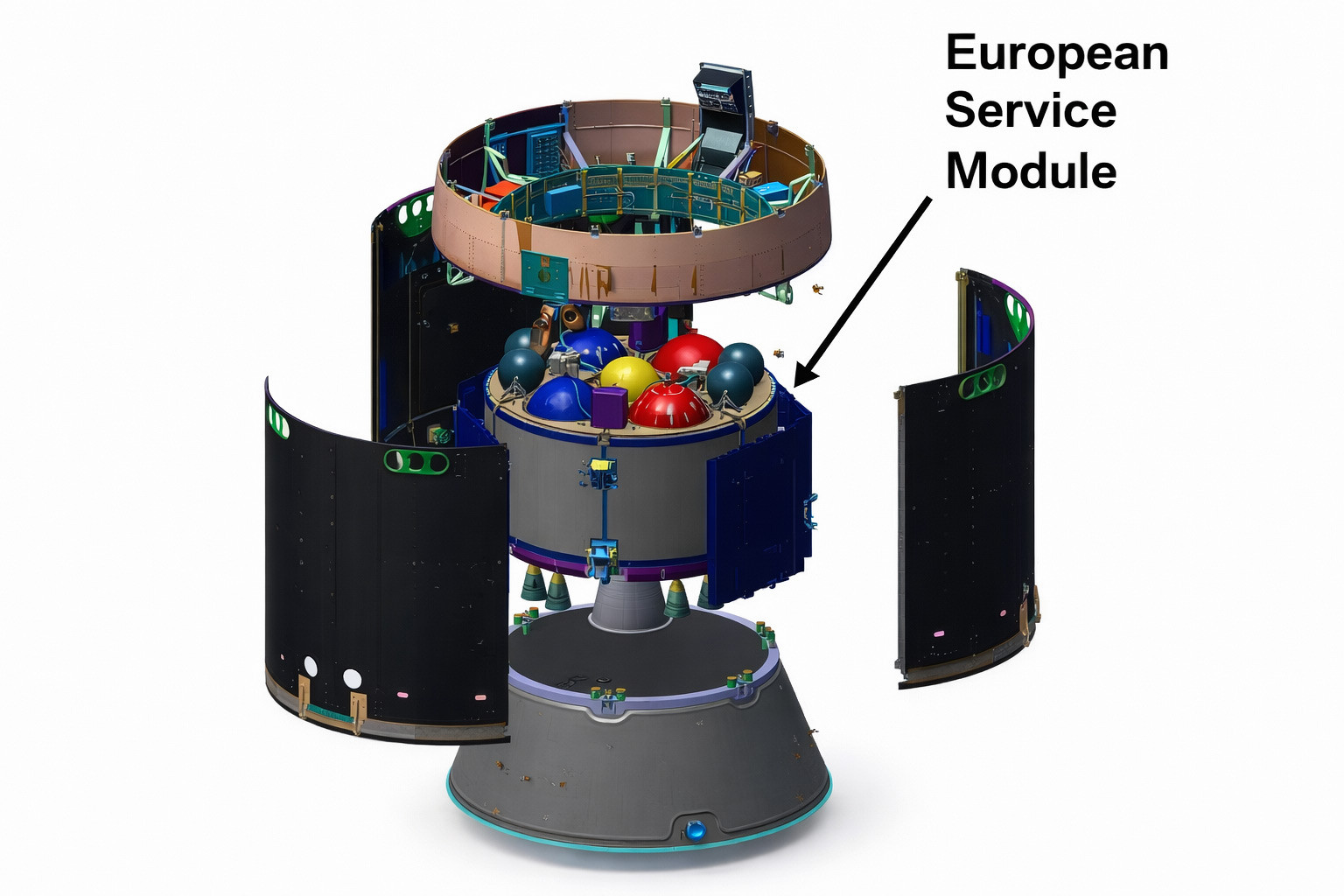Вторая часть — сервисный модуль (ESM), его построило Европейское космическое агентство ESA. Это «сердце и легкие» корабля. Модуль находится под жилой капсулой и, увы, не возвращается на Землю: он сгорает в атмосфере перед самой посадкой. Зато пока он жив, внутри работают 33 двигателя разного размера, которые обеспечивают все маневры у Луны. А четыре характерных «крыла» длиной по 7 метров каждое вращаются, чтобы всегда ловить максимум солнечного света. В том же модуле хранятся баки с водой, азотом и кислородом.