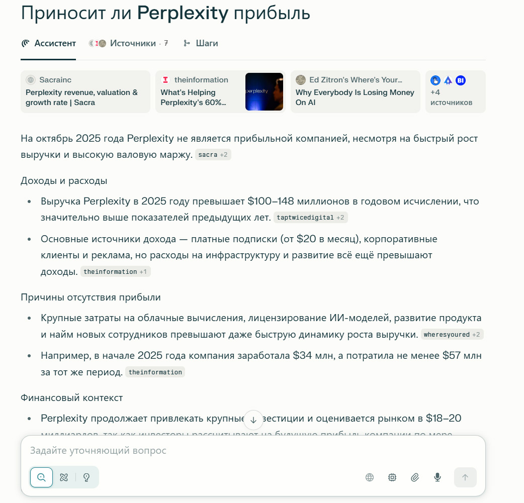 Но и в бесплатном режиме браузер хорош тем, что умеет давать ответы на вопросы. Например, если спросить прибыльна ли компания Perplexity, то получишь развернутый ответ. Мне нравится, что в ответе есть ссылки на источники, так что можно самостоятельно пройти и проверить. Предположу, что многим пользователям это понравится.