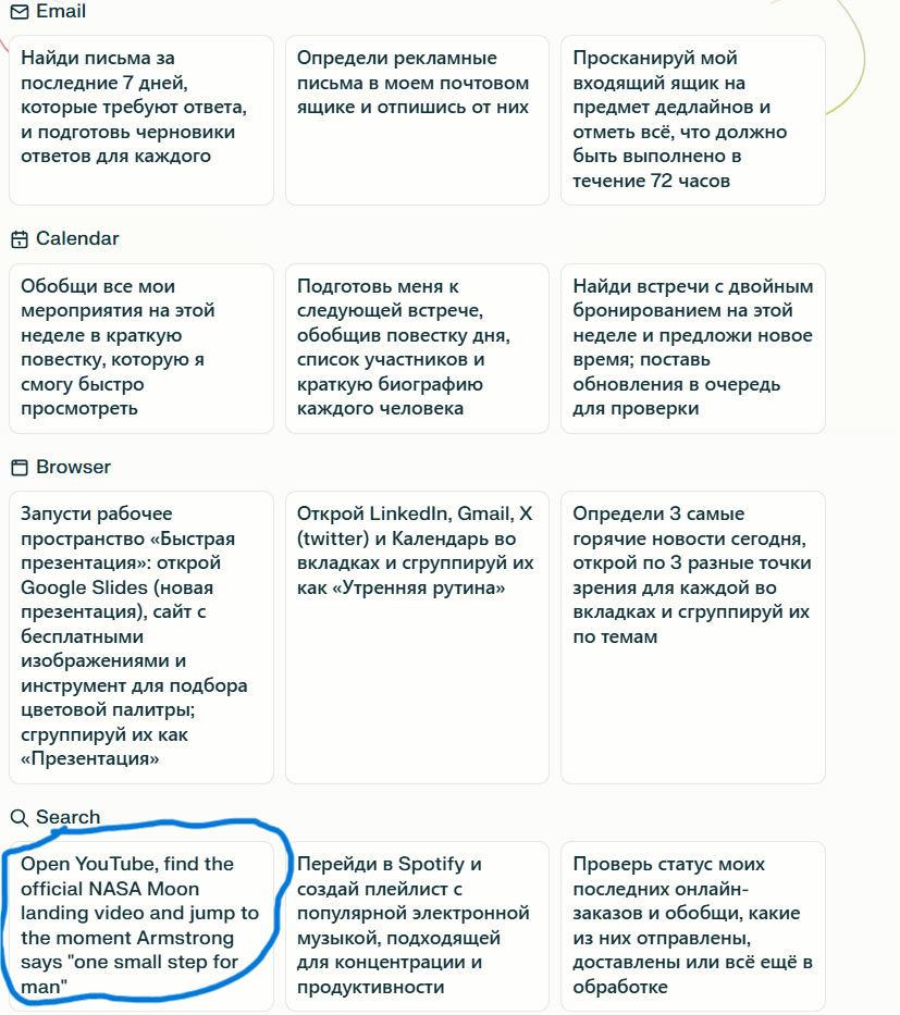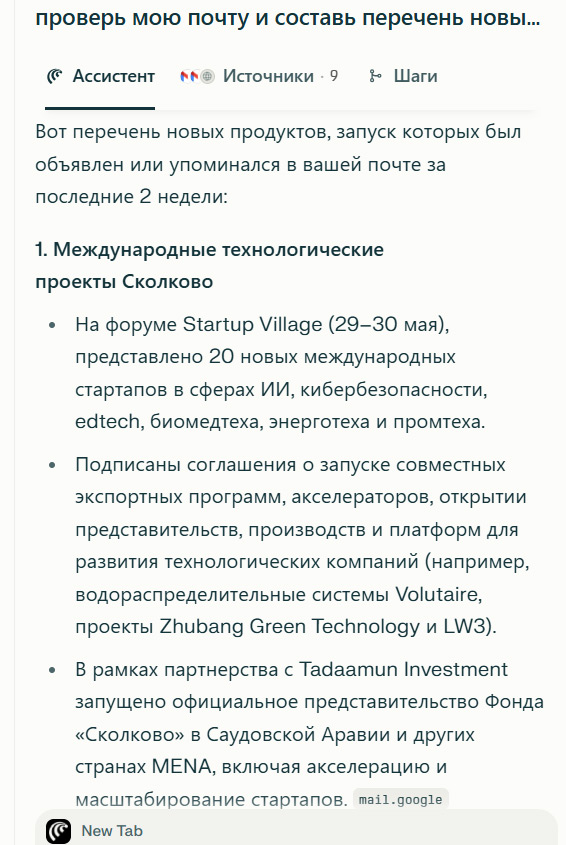 Функция «Ассистент» в теории должна работать в роли личного агента пользователя. Perplexity можно дать доступ к почте и календарю, а потом задавать вопросы. Например, найти в почте все непрочитанные письма или приглашения. Возможно, в будущем это изменится, но сейчас реализация посредственная. Мне часто присылают пресс-релизы о запуске новых продуктов. Я попросил Perplexity прошерстить почту и составить список новинок. Ассистент гордо сообщил, что задача выполнена, но почему-то в списке было всего одно письмо, которое мне прислали ещё в мае.