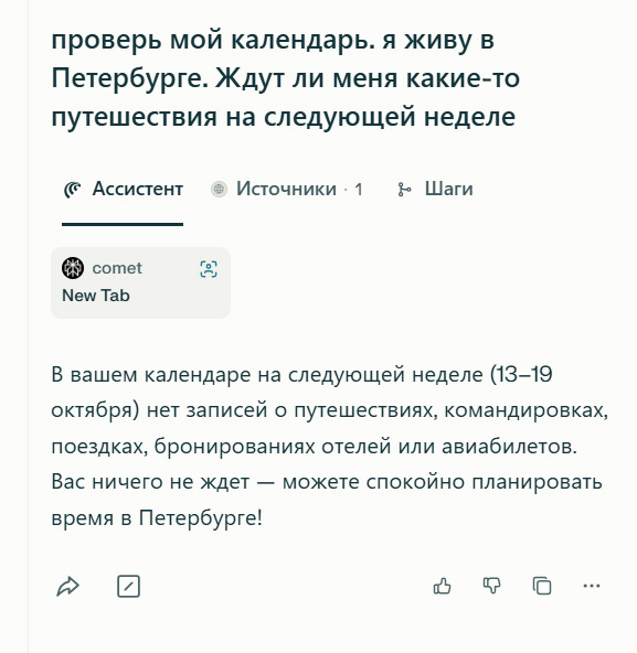 Comet эстетически приятный браузер. Мне нравятся шрифты и анимации, нравится космическая стилистика и лаконичный интерфейс. К сожалению, практической пользы для себя я в браузере не увидел. В качестве агента (нейросеть, которая умеет за пользователя выполнять функции) Perplexity уступает тому же ChatGPT, который гораздо активнее орудует в моей Google-почте.