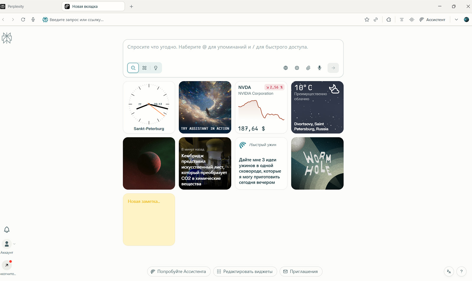 Вместо привычной поисковой строки по центру диалоговое окно для общения с Perplexity. Точно также если ввести запрос в адресную строку, то на него ответит Perplexity. Исключение сделают только для интернет-адресов.
