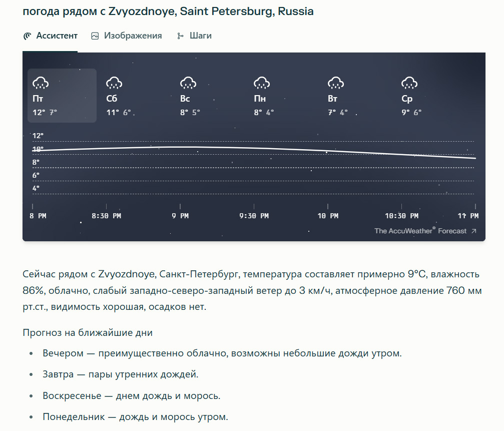 На выбор дается 9 виджетов. Виджеты довольно бестолковые. Любопытно, что все виджеты пропускаются через Perplexity. Например, если нажать на погоду, то браузер не просто покажет картинку с прогнозом, но попробует его трактовать.
