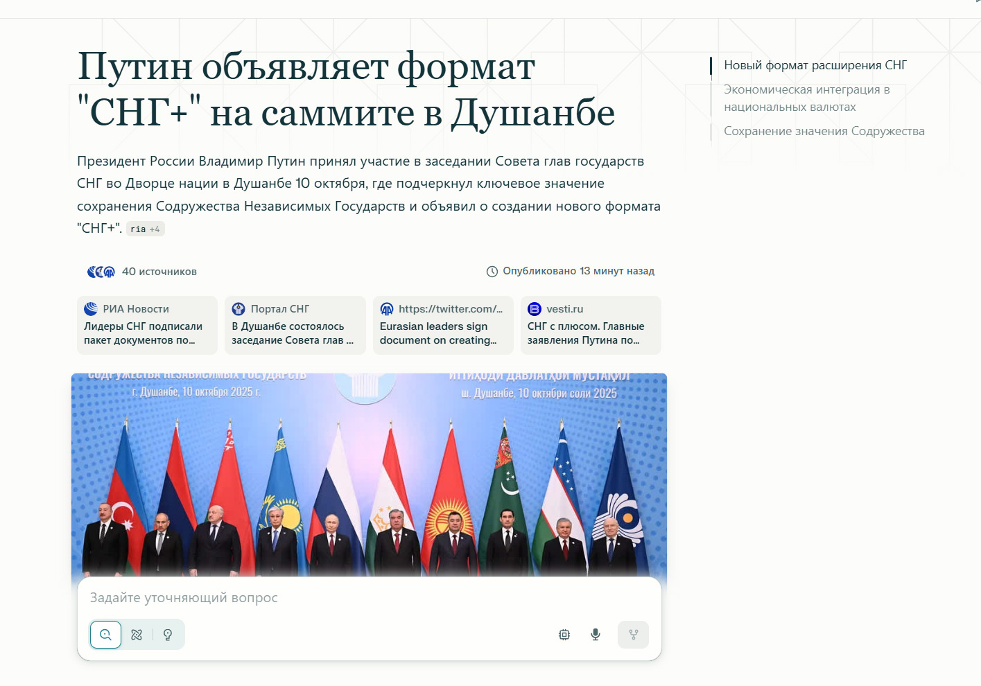 По какому принципу новостной виджет подбирает новости я не понял. Но принцип работы такой же. Стоит нажать на новость, как браузер произведет интеллектуальную работу и перескажет новость, собрав дополнительную информацию в других источниках. В диалоговом окне можно задать уточняющие вопросы. Так, я спросил, а что Путин ел на саммите Душанбе. Perplexity не стал фантазировать: «Точное меню саммита не раскрывалось, но известно, что после заседания главы государств СНГ, включая президента Путина, участвовали в неформальном обеде, а также на «вечере дружбы» ознакомились с национальными блюдами Таджикистана и богатствами региона»