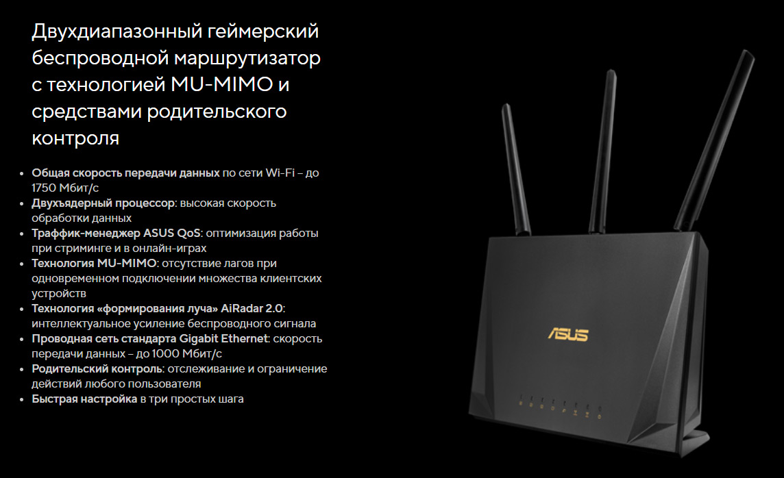 Это ASUS RT-AC65P. И тогда, когда я решил его купить, меня очень подкупило то, что пообещала реклама. Я рассудил так: если хотя бы половина из того, что написано правда, то должно быть нормально. Тем временем вот то, что обещала Asus: