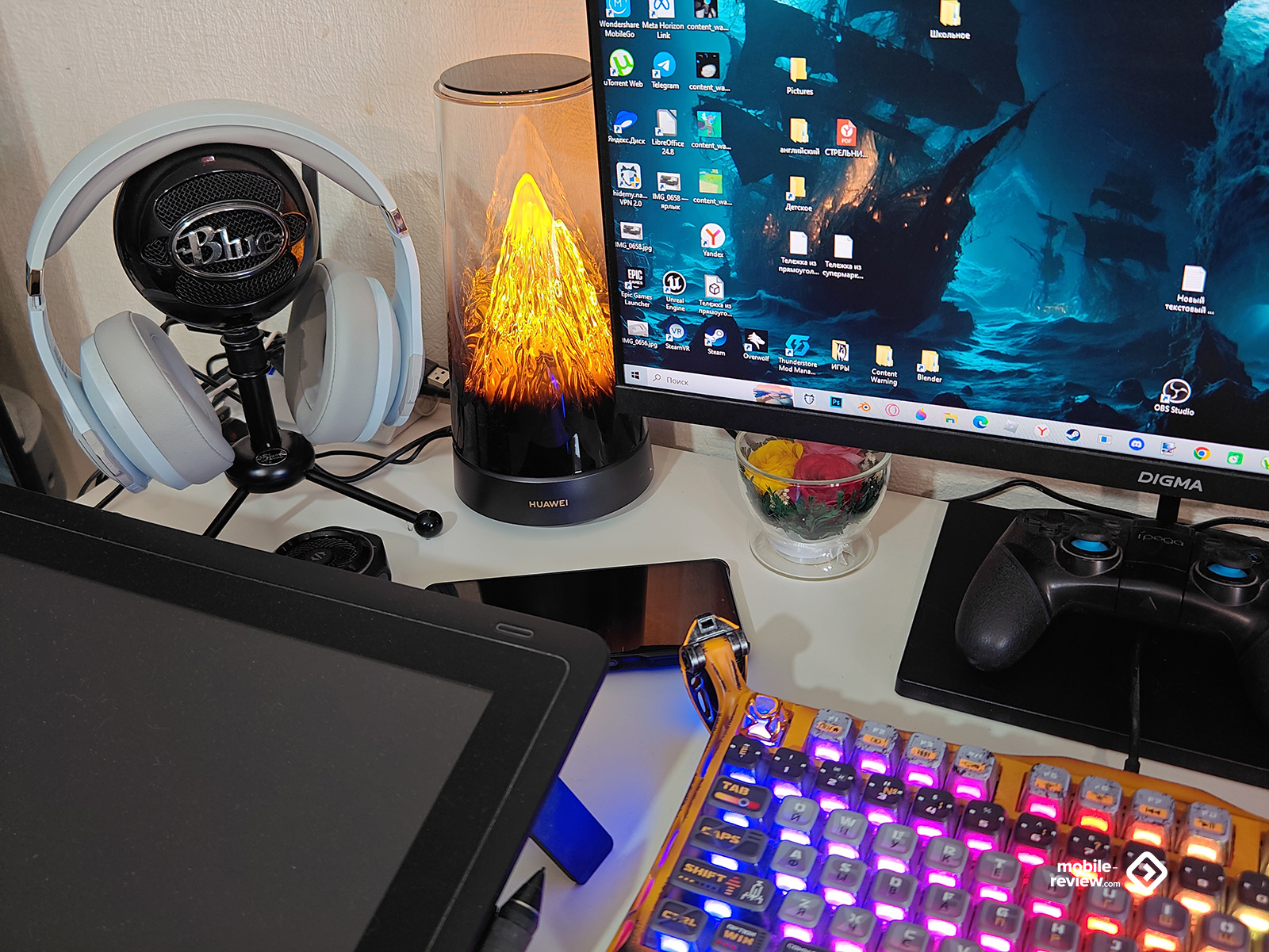 Вы к нему провод как подвели? Ладно у меня он в плинтусе, а затем за столом прячется и тянется на виду сантиметров, может, десять – пятнадцать. Но у вас же открытое пространство. Под столом у вас еще и сетевой фильтр лежит, чтобы воткнуть зарядное устройство? А его кабель уже до розетки на стене тянется? На мой взгляд, схема презентации требует доработки.