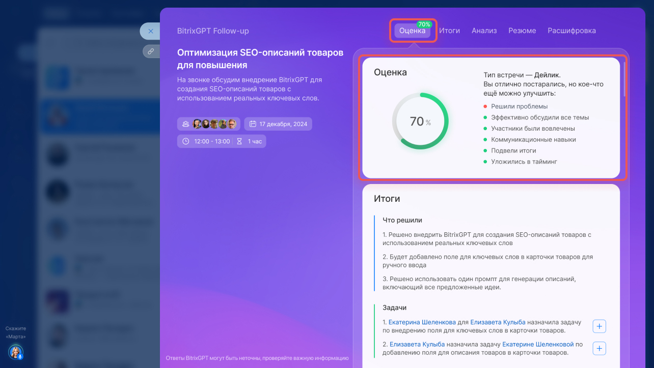 А ещё у Битрикс24 есть собственная нейросеть. В видеозвонках она умеет расшифровывать аудио в текст, распределяя реплики по участникам совещания. Также она автоматически выделит главные моменты, распределит задачи, даст практические советы и оценит эффективность встречи.