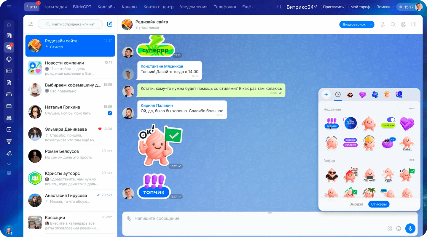 Чаты и каналы. Важно дать сотрудникам возможность общаться так, как им нравится, поэтому в Битрикс24 есть эмоджи, стикерпаки, аудиосообщения, видеокружки. Причем речь идет о рабочих чатах, а также о группах и каналах для развлечений: несерьезные флудилки — это места, где сотрудники могут пообщаться неформально и подружиться.