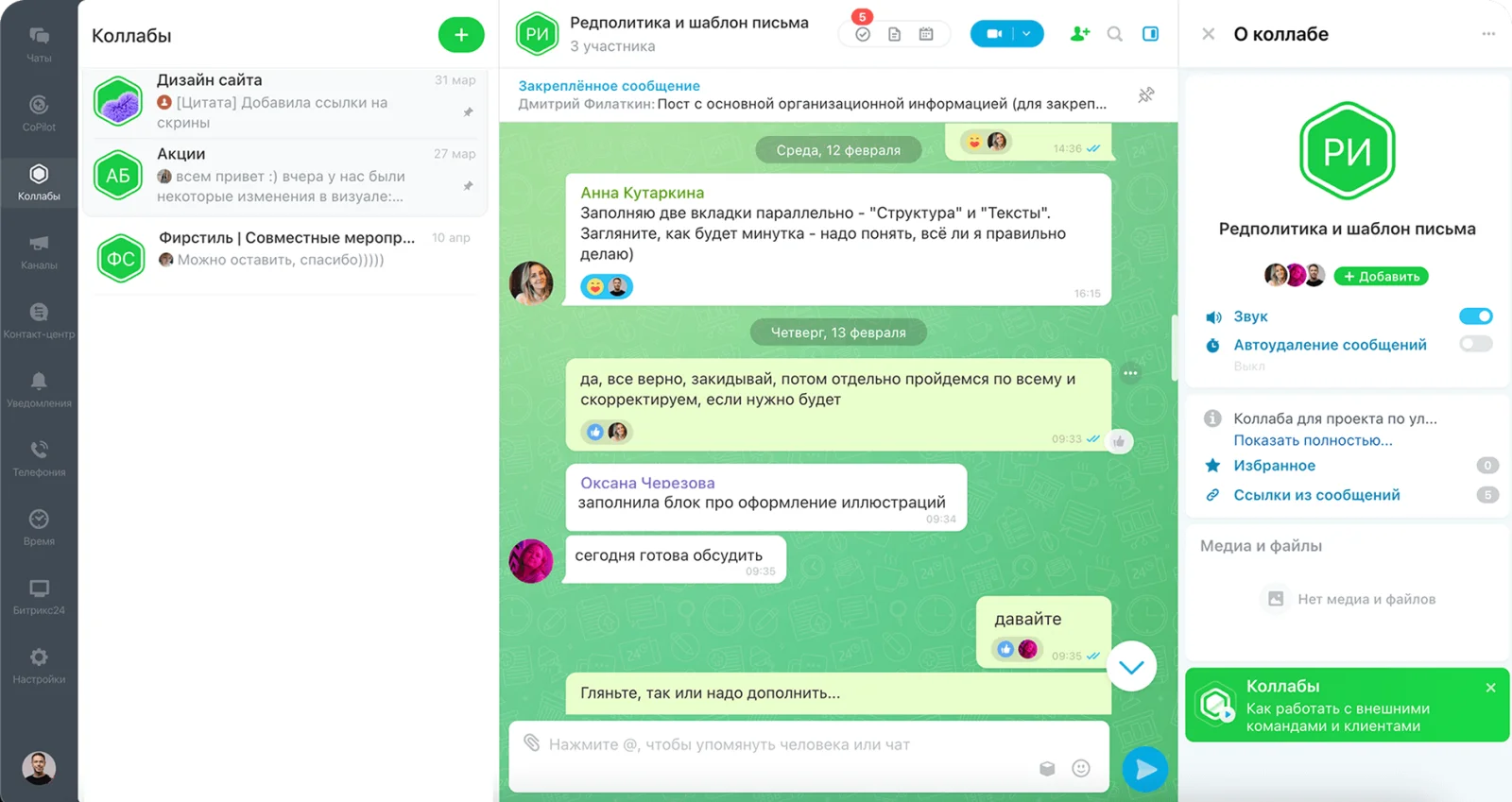 Только для своих. Главный минус обычных мессенджеров в том, что там не только ваши сотрудники и коллеги, но и множество сторонних пользователей. Из-за этого всегда есть вероятность отправить сообщение не в тот чат. При этом у продвинутых корпоративных мессенджеров есть возможность подключать к чатам внешних пользователей безопасно, без доступа к корпоративной информации. Это могут быть клиенты или сторонние партнеры. Например, в Битрикс24 такая функция называется «коллабы». Она позволяет создавать общие чаты с внешними командами, но это реализовано таким образом, что случайно добавить человека со стороны не получится.
