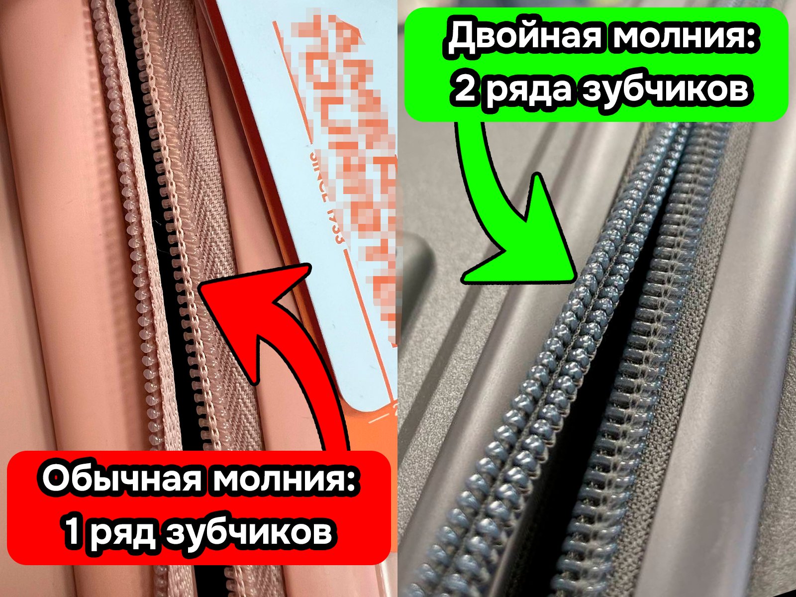 При выборе чемодана важно обращать внимание и на тип молнии. Молнии бывают одинарные и двойные. На одинарных с каждой стороны по одному ряду зубчиков. На двойных молниях — по два ряда зубцов.