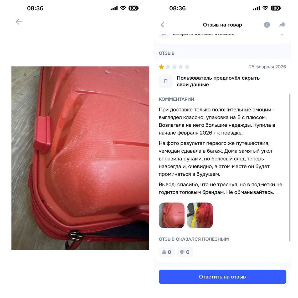 Для начала предлагаю обозначить, что именно считать поломкой чемодана. Вот свежий пример из жизни: девушка купила на маркетплейсе чемодан и оставила такой отзыв о нём.