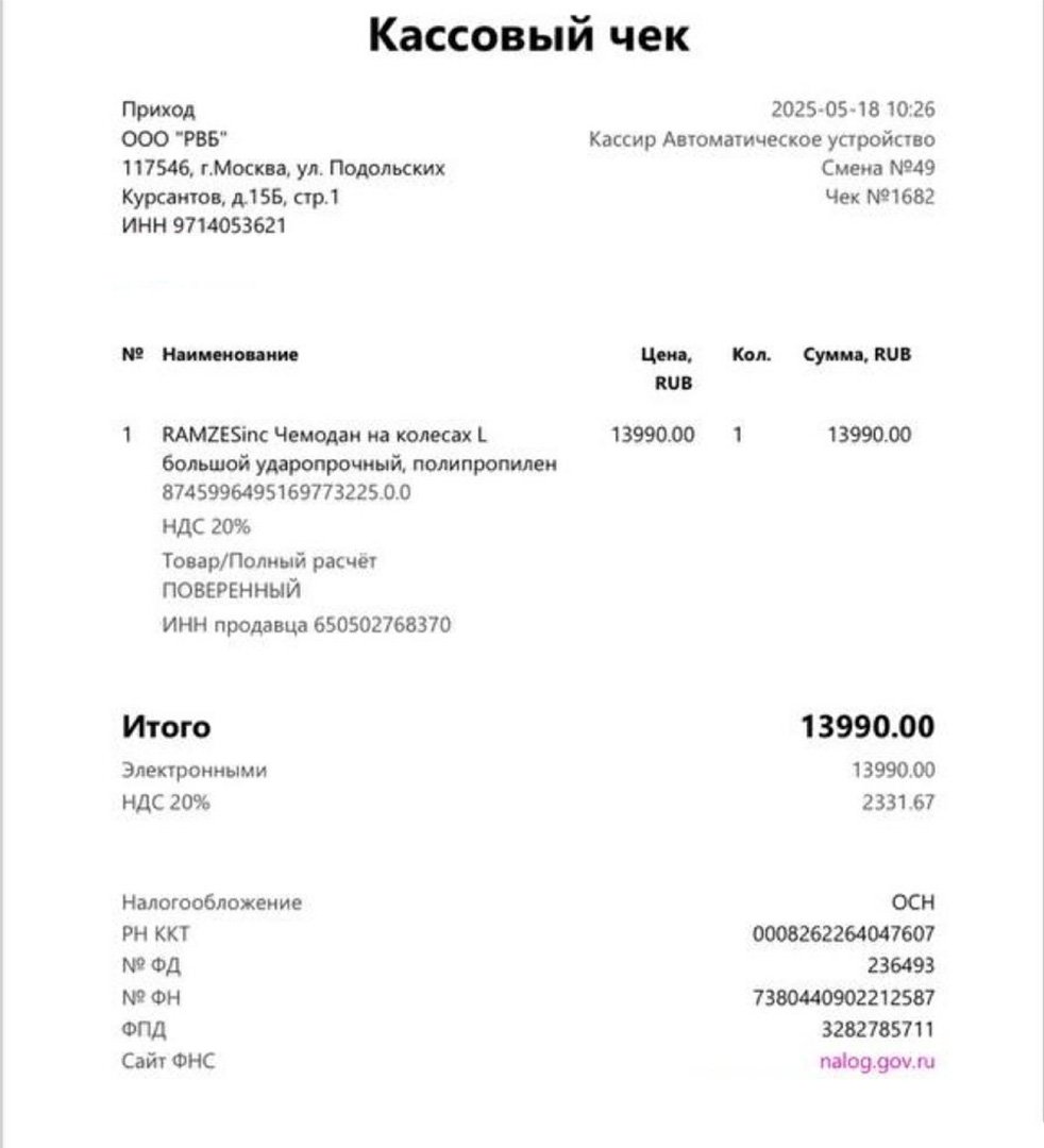 Ваш главный козырь — это чек за поврежденный чемодан. Поэтому я рекомендую всем своим клиентам покупать чемодан для самолёта не через маркетплейс, а на сайте производителя. Вы получите корректно оформленные документы и правильный чек, где четко указана модель чемодана и цена. Вот такие чеки, например, мы выдаём при оформлении заказа дубайских чемоданов на сайте ramzes-russia.ru