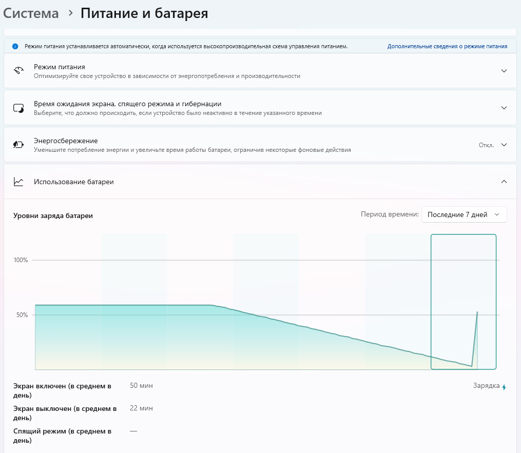 Выделен четверг. Я закончил статью, Alt + F4, завершение работы. Подсветка мигнула красным, протирание экрана и клавиатуры салфеткой, закрытие крышки, извлечение радиопередатчика (или кабеля) трекбола, отсоединение сетевого кабеля, ноутбук отправляется в чехол, а затем в ящик стола до понедельника. Но по расходу аккумулятора мы видим, что именно с конца работы с устройством в четверг и начинается расход батареи. При этом встроенный мониторинг не выдает никаких приложений, которые бы расходовали батарею. При питании от сети он, к слову, вообще не пишет, что аккумулятор используется какими бы то ни было программами. И такое нет-нет, да происходит. Не каждую неделю, но раз в пару месяцев батарея сама собой разряжается. Что поменялось сегодня? Ничего. Я так же достал ноутбук, так же подсоединил к нему кабель питания и пару секунд смотрел на цвет индикатора зарядки. Обычно он горит секунд пять красным цветом, обозначая зарядку, но потом переключается на белый, демонстрируя, что максимальный заряд в 60% достигнут, после этого я нажимаю на кнопку включения. Но сегодня он горел красным непрерывно. Я обычно мысленно проговариваю, что бук, видимо, что-то «майнил» на выходных, и спокойно залипаю на пять минут в смартфон (в Obsidian), чтобы оценить, о чем планировался новый текст. Затем включаю его, и уже ничуть не опасаясь резкой просадки заряда вплоть до отключения, занимаюсь привычными делами. И никаких нервов. Строго говоря, экономится всего минуты полторы, которые тратятся на загрузку ноутбука, ввод пароля, а затем блуждание курсора по панели и клик по иконке браузера. Решилась ли проблема с разрядом аккумулятора? Нет. Он продолжает в том же духе. Но, зная о вероятности подобного события, я словно бы подготовил себя к нему, а потому и не удивляюсь. Ну «скриворучили» что-то программисты. Бывает. А, может, реально какой-то вирус был подхвачен и компьютер что-то там делает, пока выключен, отправляет какие-то сведения. Мне, если честно, не верится в подобное. Но мало ли. Кстати, можете в комментариях рассказать, если у кого-то была подобная проблема. Со старением аккумулятора или операционной системой Windows 11 я это не связываю, поскольку подобное случалось и в первый месяц после приобретения устройства.
