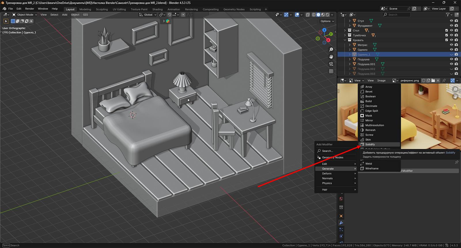 Процесс с видео выше уже не должен вызывать сложностей. Добавление стандартных объектов, перемещение, масштабирование, удаление ребер, заполнение пустот гранями. Все это мы уже много раз делали. Горячие клавиши подсвечиваются. Новым является только придание толщины объекту с помощью модификатора. Для этого мы увеличиваем окно, которое находится под картинкой с референсом, выбираем вкладку с иконкой гаечного ключа, нажимаем на кнопку Add Modifier и выбираем в разделе Generate модификатор Solidify.