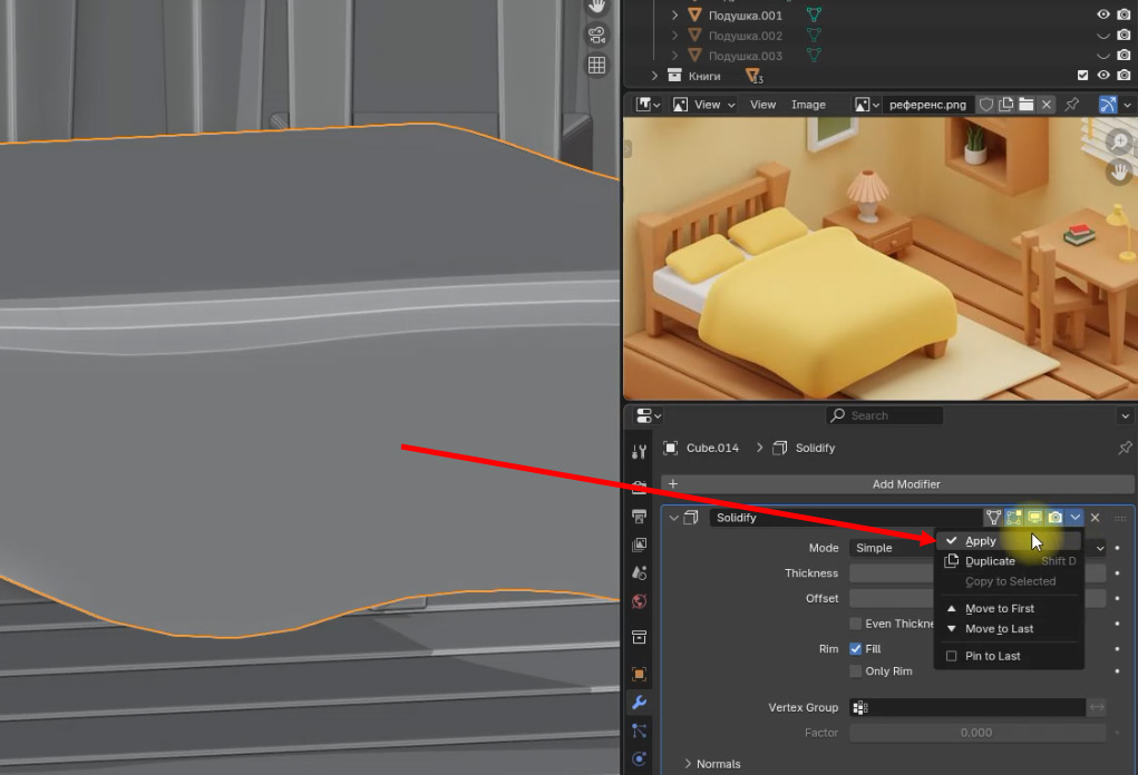 В дальнейшем вы будете чаще пользоваться поиском по названию, но сейчас пока запоминайте, какой и где находится. После того как модификатор настроен (в данном случае выбрана толщина), его необходимо применить, чтобы геометрия объекта приобрела ту форму, которую мы видим. В противном случае при отключении или удалении модификатора полученные изменения меша также исчезнут. Применить модификатор нужно вот здесь:
