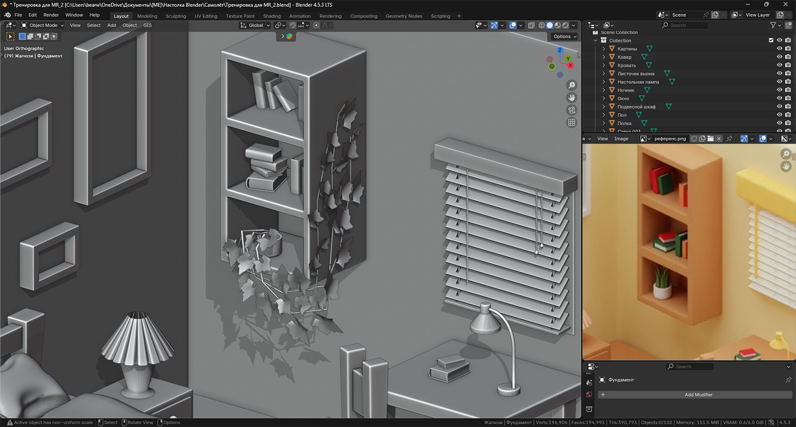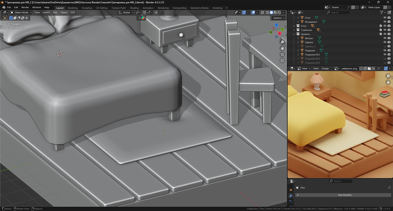 Сегодня мы закончим с комнатой. Урок будет не только в том, что не нужно бесконечно долго сидеть над моделированием одного объекта, чтобы не перегореть, но и в том, что не нужно слишком долго сидеть над одной сценой. Это установка, кстати, позволит грамотнее планировать не только количество и детализацию объектов, но и отточит навык выбирать способы моделирования. Одно дело, когда будет нужен скульптинг каждой морщинки на лице и другое, когда достаточно шаблона с минимальным изменением внешности, например.