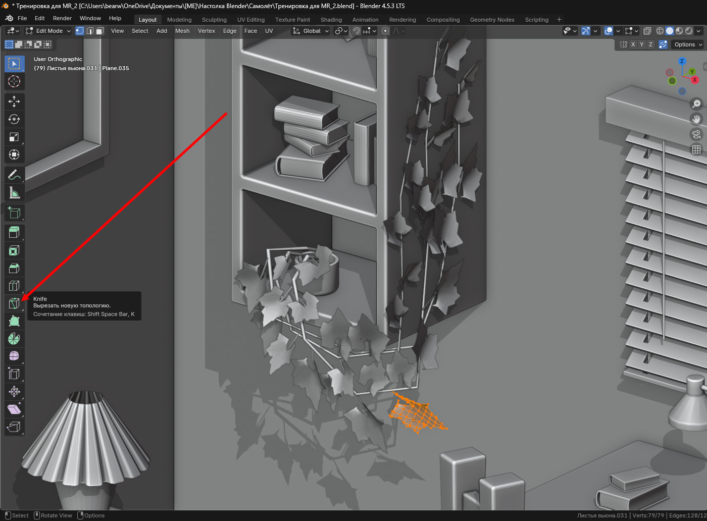 Комната оживает. Когда придадим цвета, станет еще реалистичнее. В процессе работы над объектами мы использовали новый инструмент. Он называется Knife. Автор канала Blender Secrets Jan van den Hemel как-то назвал этот инструмент самым лучшим другом. В данном случае он помогает придать нужную форму объекту. Единственное, после его применения нужно немного подкорректировать положение вершин, чтобы полигоны по возможности остались четырехугольными. Инструмент вызывается по нажатию на клавишу с английской буквой K. В панели инструментов же он находится здесь: