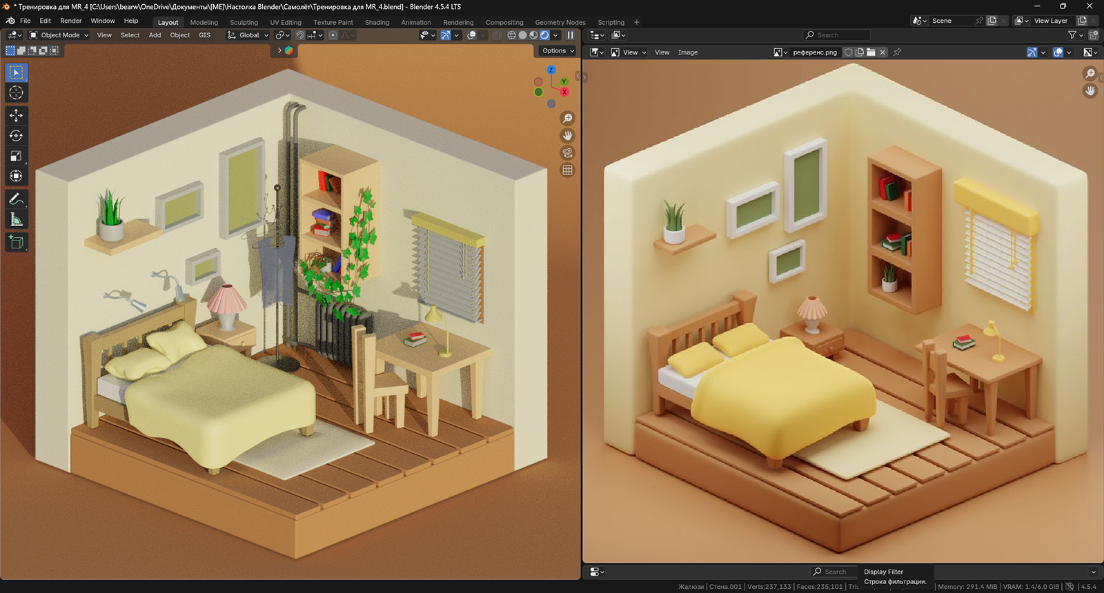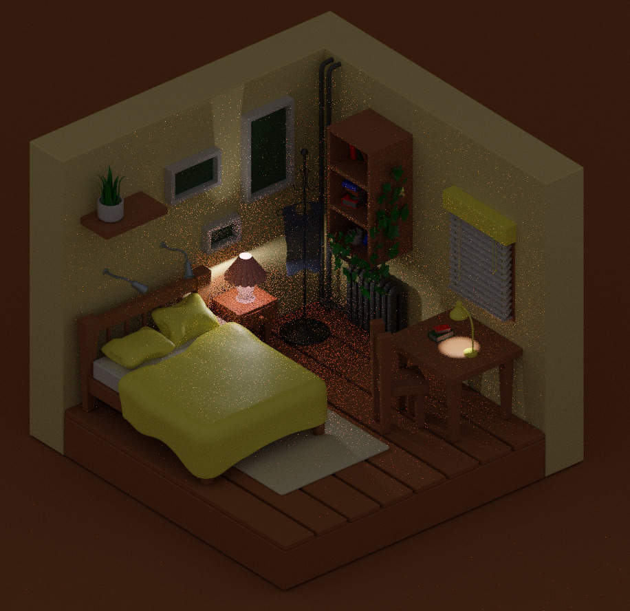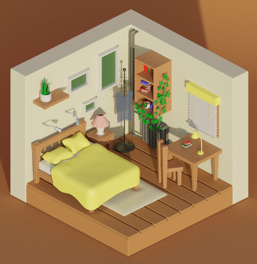 Думаю, что именно так мы и оставим. Еще раз напомню, что слишком долго над мелкими деталями неответственной сцены сидеть не нужно. И хотя мы здесь многому учились, местами намеренно усложняя себе процесс создания нашей изометрической комнатки, всему должен быть предел. Довольно. Иначе можно рассмотреть, что у нас и щели между досками на полу не так хорошо видны. Розеток на стенках не хватает. И вообще можно было бы и ноутбук на стол положить. И, кстати, на майке не видно краев ткани, поэтому можно сделать имитацию обработки. И все это на самом деле так, найти, что улучшить, можно всегда. Старайтесь контролировать этот процесс, постоянно напоминая себе, какую цель вы преследуете.