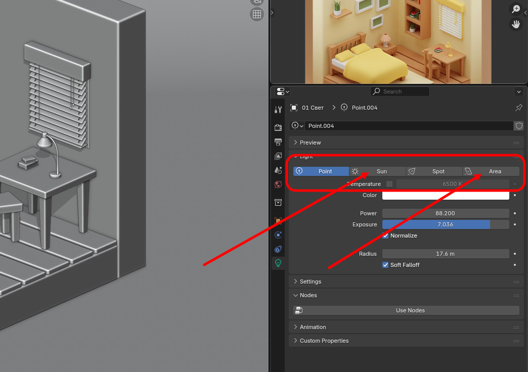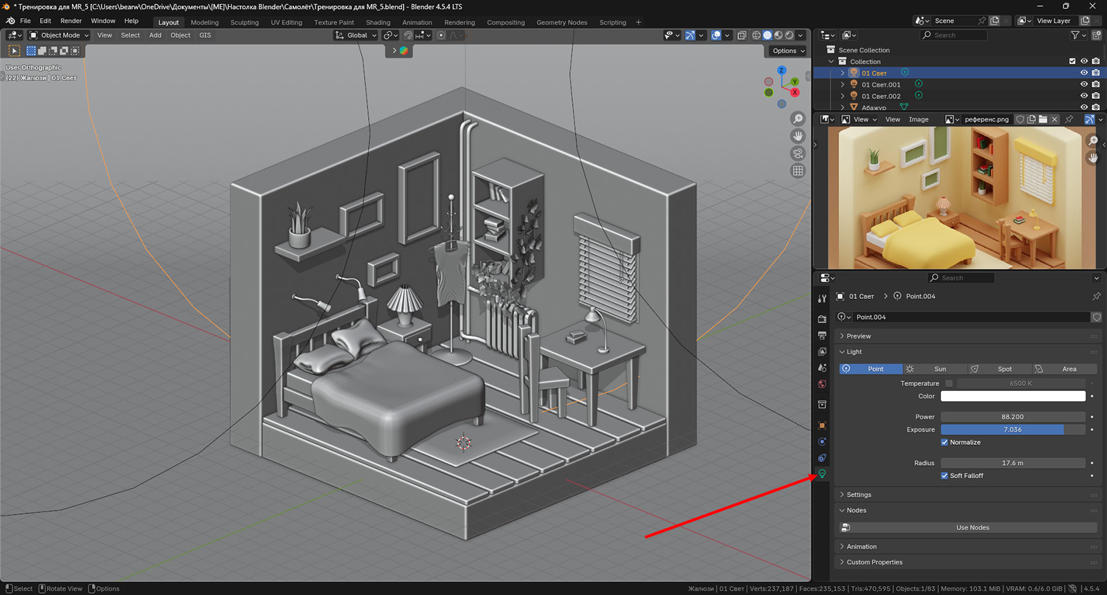 Артефакты в виде точек мы разберем на следующем уроке, когда будем включать рендер. Пока же давайте рассмотрим еще одну полезную особенность. Мы упомянули, что ручная расстановка источников света — весьма трудоемкая задача. Но совсем ее игнорировать не получится. Как, например, в данном случае, где нам потребовалось сделать включенную лампу. Но при этом настраивать весь свет вокруг не хочется. Поэтому существует гибридный режим. Можно активировать и свет HDRI-карты, и тот, что мы добавили руками. Вот как это работает: