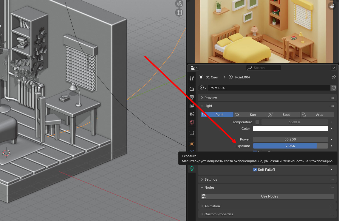 Сначала нас интересует параметр Exposure. Все потому, что в данный момент добавленный источник света как будто бы ничего не делает. В сцене светлее не стало. Поэтому мы прибегаем к изменению Exposure, чтобы понять, как себя ведет сцена при его изменении.