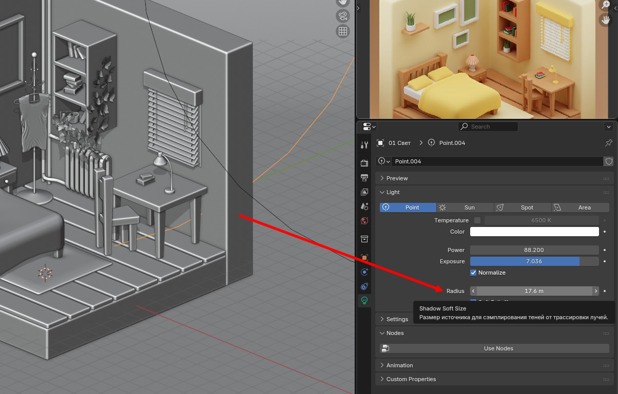 Видно, что добавленная «точка» света начинает освещать. Но освещение происходит словно бы от спички. И если увеличивать силу ее свечения, то мы можем привести к тому, что в одном месте будет уже буквально засвет материала, а в другом пространство все еще будет затемнено. Поэтому следует прибегнуть к изменению еще одного параметра.