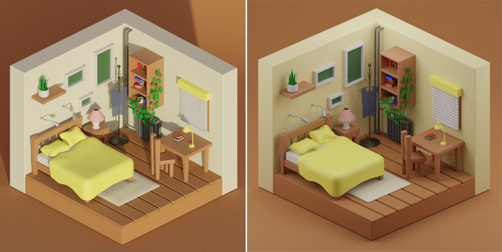 Однако нам лучше все же немного пересмотреть цветовую гамму. Например, мы сделали кровать, тумбочку со столом и стулом и пол разных цветов. Из-за этого у нас получился некоторый винегрет в объектах. Они перестали друг с другом сочетаться. Также немного тускло смотрится цвет, который мы применили к горшкам, рамам картин и планкам жалюзи. Немного подвигали ползунки настроек цветов, и у нас получилось следующее: