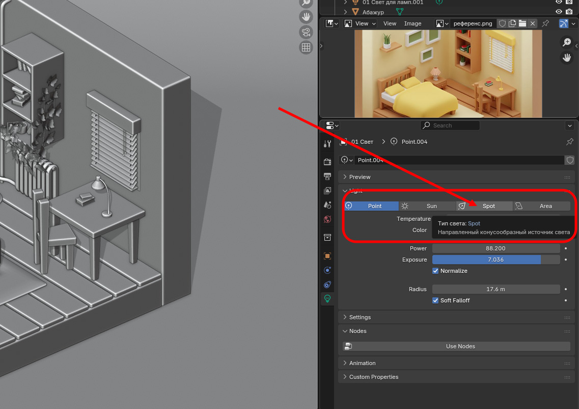 Процесс добавления источника света ничем не отличается от того, что мы рассмотрели выше. Различия начинаются только на этапе настройки в окне под референсом. Главное заключается в том, что вместо типа Point нужно выбрать Spot: