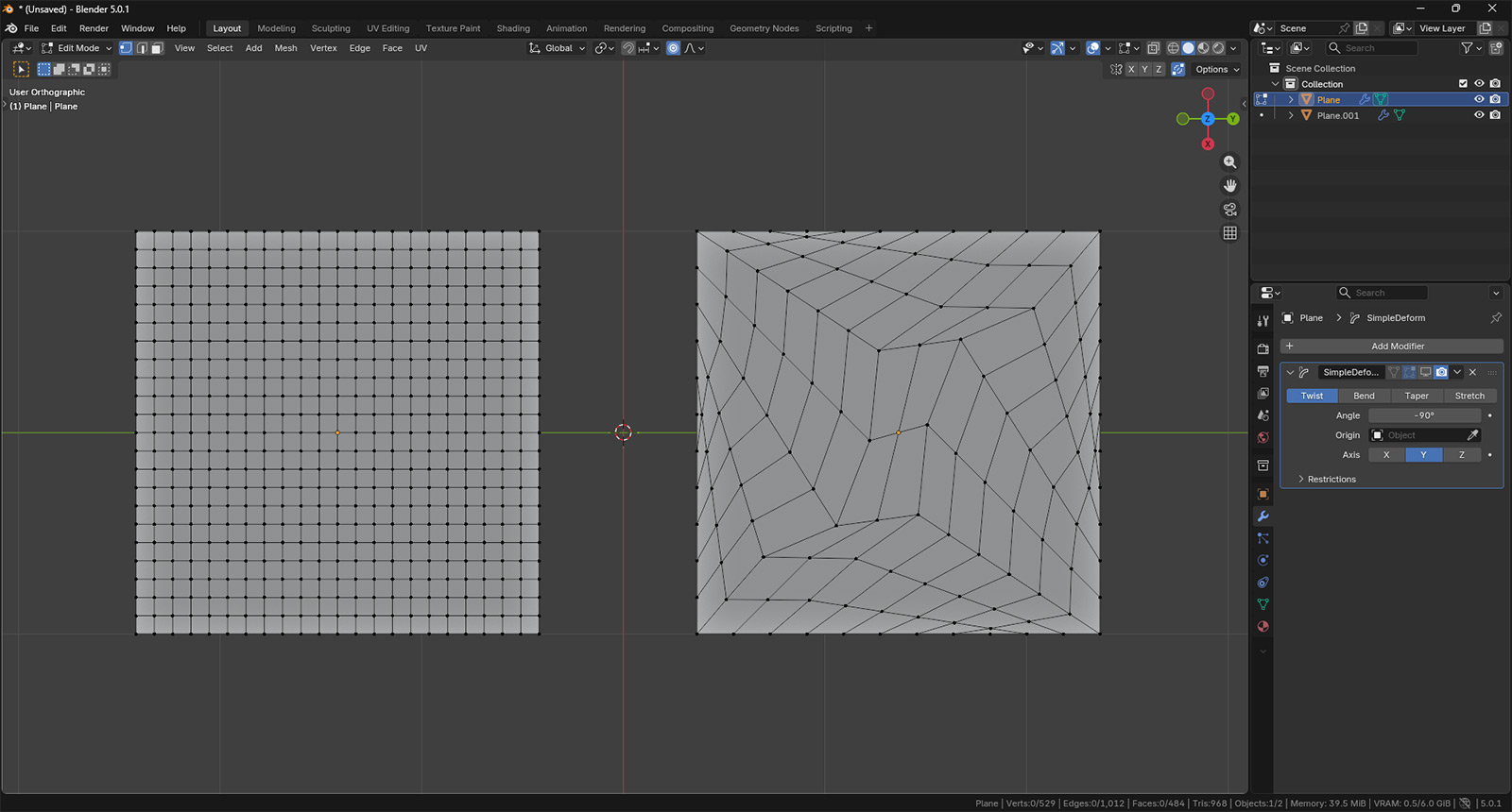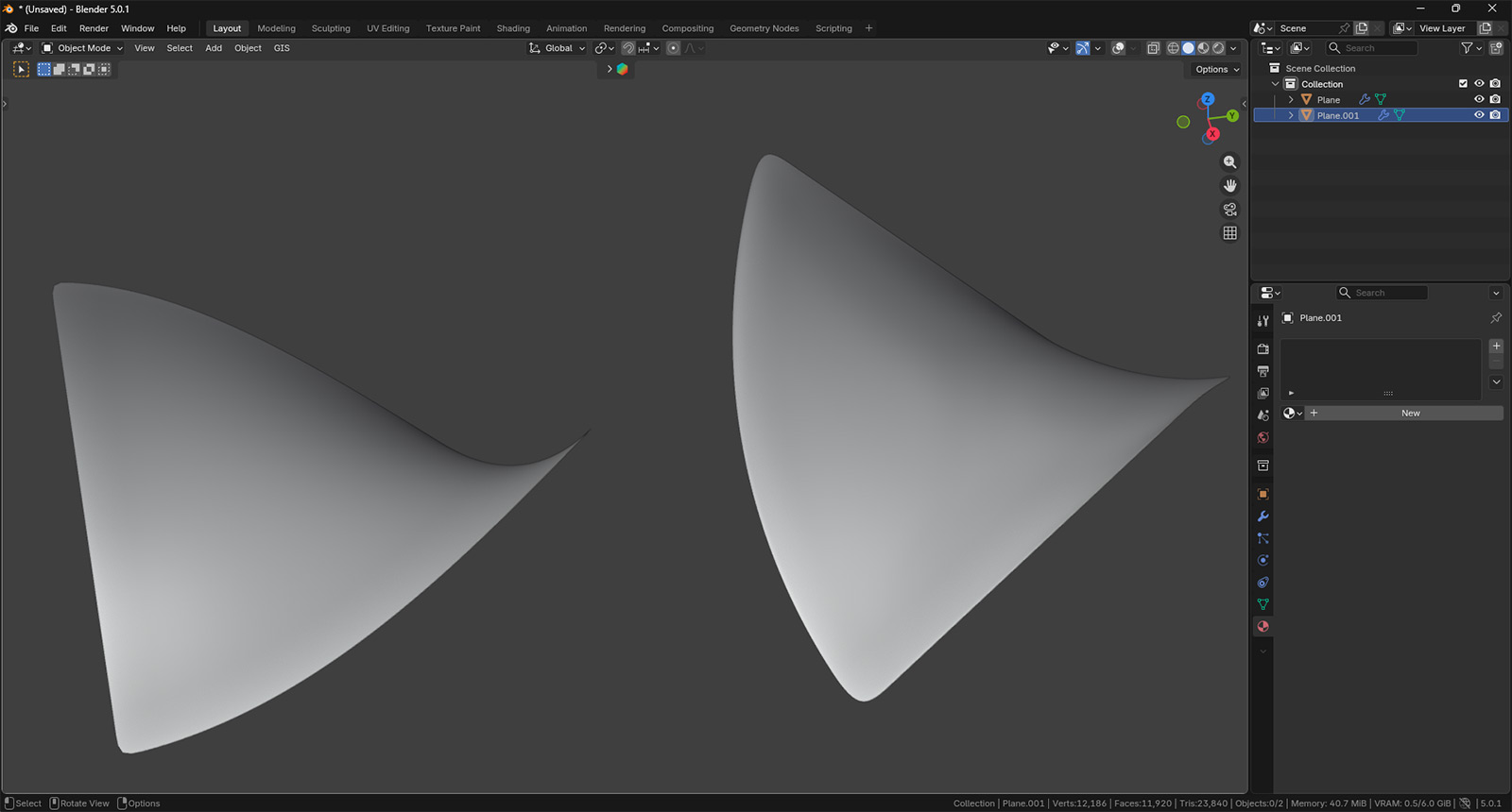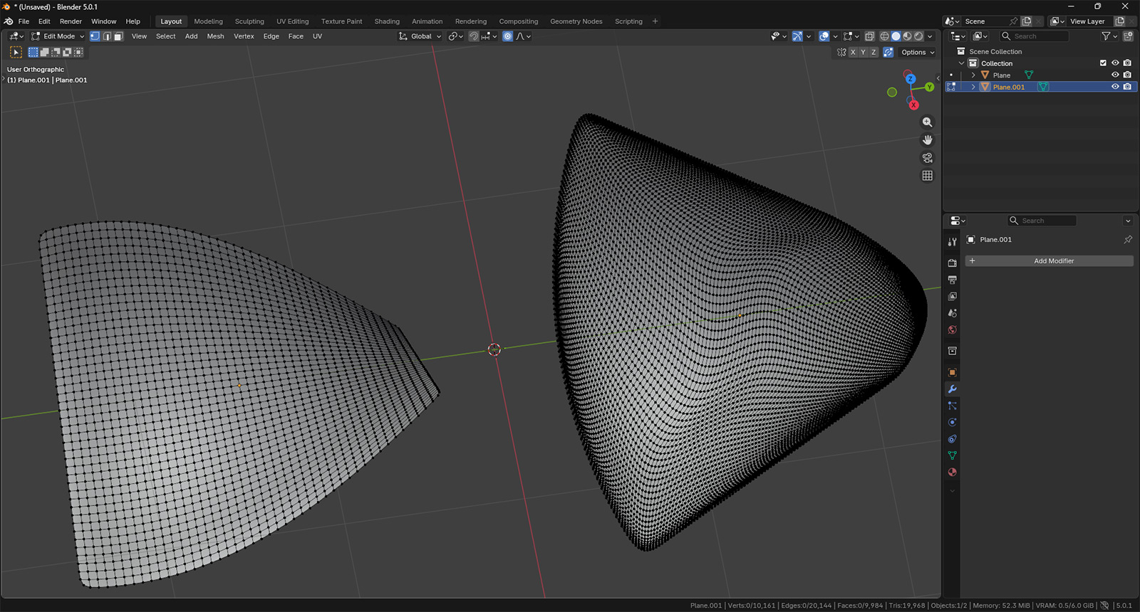 Видно, что первая плоскость — это примерно 4 тысячи полигонов, тогда как вторая в пять раз тяжелее. Именно этим часто и достигается гладкость некоторых объектов с очень корявой сеткой. Однако если речь идет о квадратной плоскости, то все еще не так плохо. Посмотрите сами: