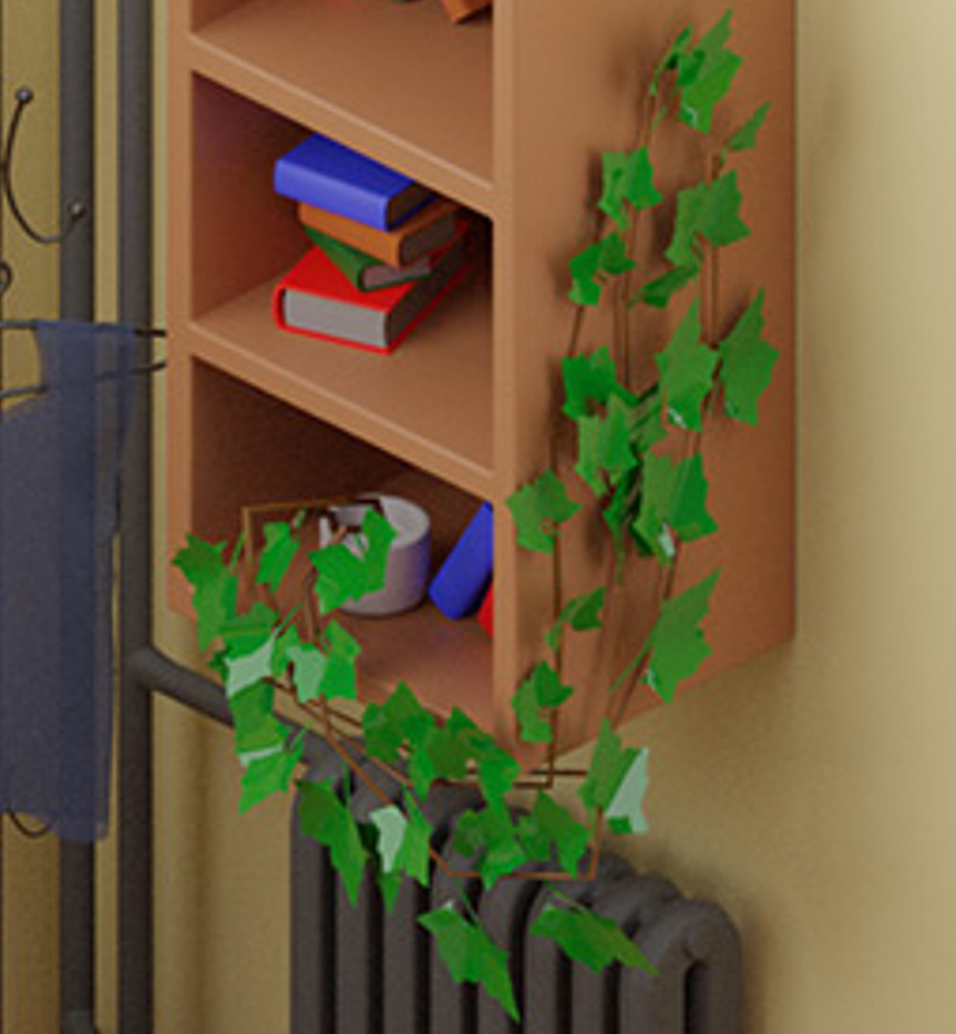 Если обратить внимание на ту самую информационную строку в правом нижнем углу, то вы увидите, что после того, как произошло автоматическое сглаживание геометрии с помощью модификатора Subdivision Surface, количество полигонов стеблей нашего вьюна стало равным почти 14 тысячам. После же удаления модификатора число весьма заметно упало (до 216). На откровенно небольших сценах, в принципе, иногда допустимо так действовать. Особенно если нужен будет только один кадр, как у нас в сцене с комнаткой. Но если это что-то, что потребует дальнейшего использования объекта в других сценах, то геометрию лучше оптимизировать. Кроме же тяжести меша, проблема заключается еще и в том, что в столь сильно сглаженных объектах сложной геометрии возникает диспропорция размера полигонов.