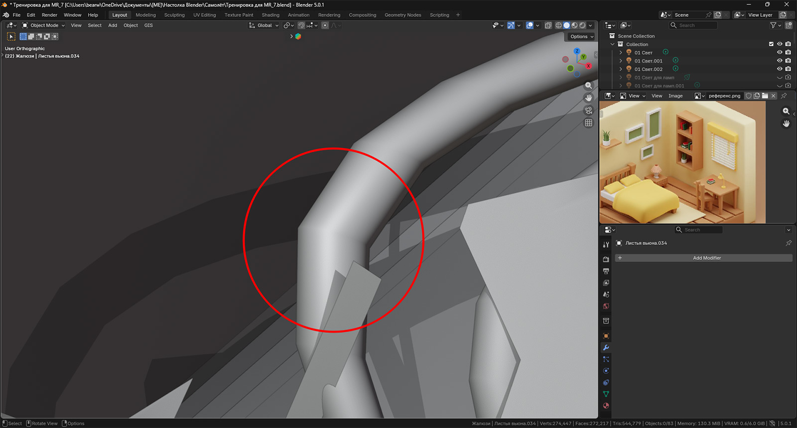 Но часто к увеличению количества полигонов прибегают в более сложных телах. Давайте, например, взглянем на нашу изометрическую комнату. В частности, вот на этот элемент: