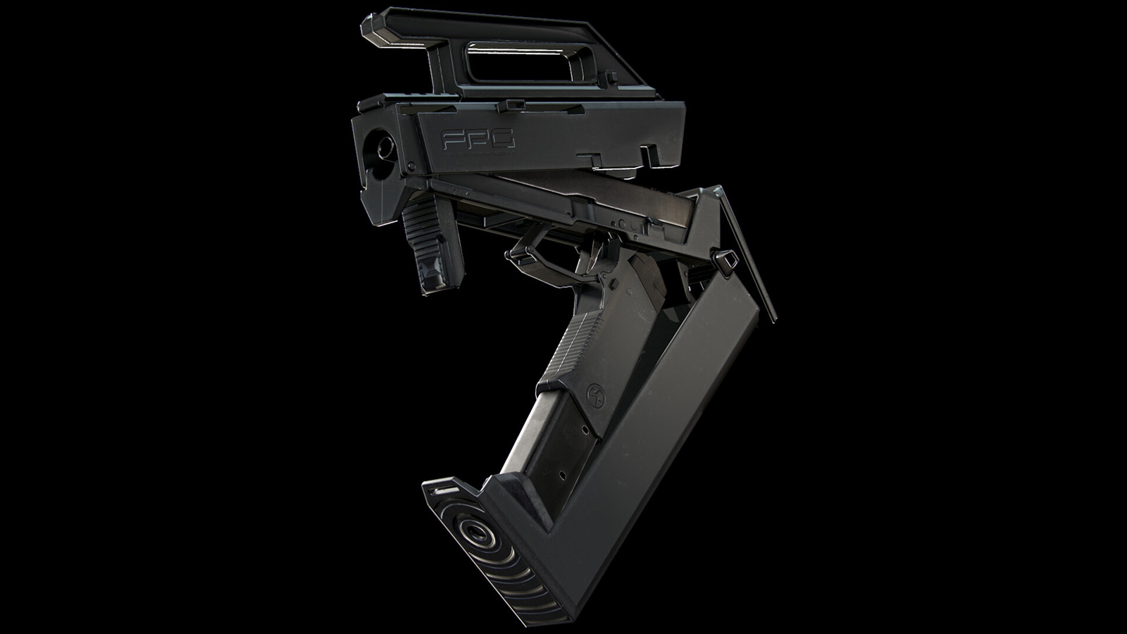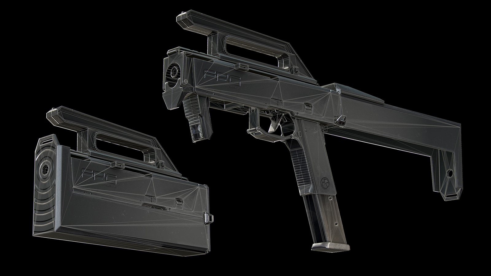 Выдавленные надписи, рифление рукояти и выемки на фронтальной стороне коробки, которая превращается в приклад. Все это довольное плавное. В теории это потребует весьма большого числа вершин. Однако на деле все выглядит вот так: