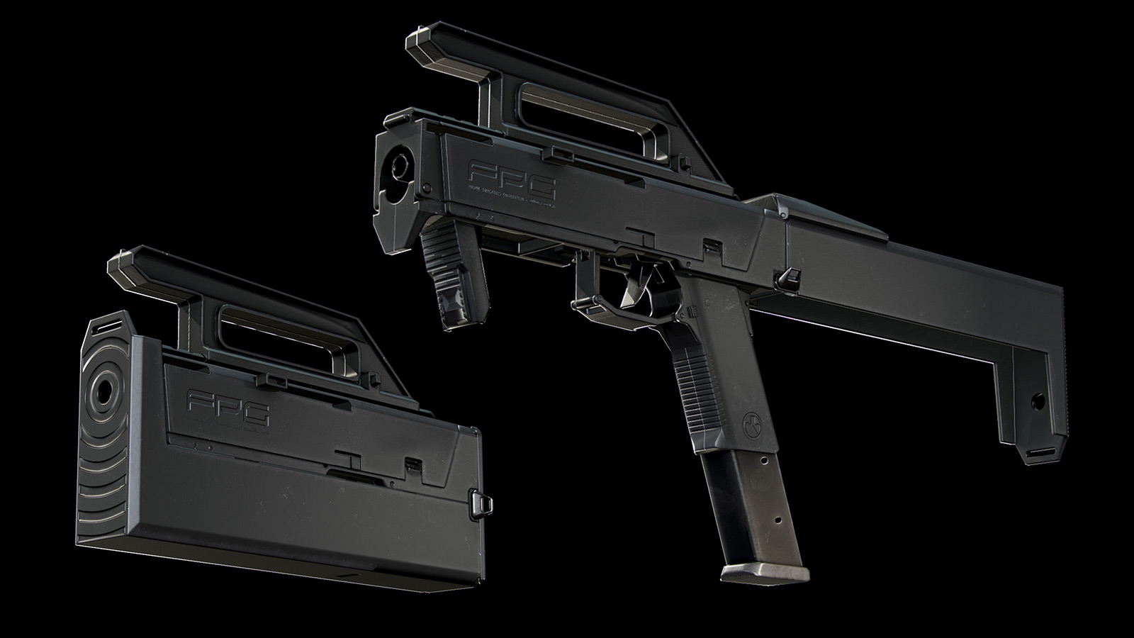 Количество полигонов возрастет, но модель все еще останется низкополигональной. В контексте полигональности Error 404 упомянул слово gameready. Оно означает, что модель готова к использованию в качестве игрового меша. Часто можно встретить подобное, когда попадаются модели каких-нибудь автоматов. Часто автор даже показывает, как выглядит сетка. Вот, например, отличный проект автора Aleksandra Akimova с ArtStation: