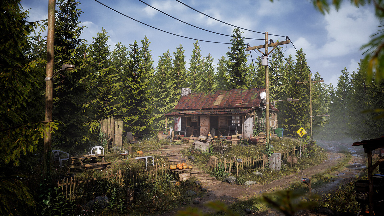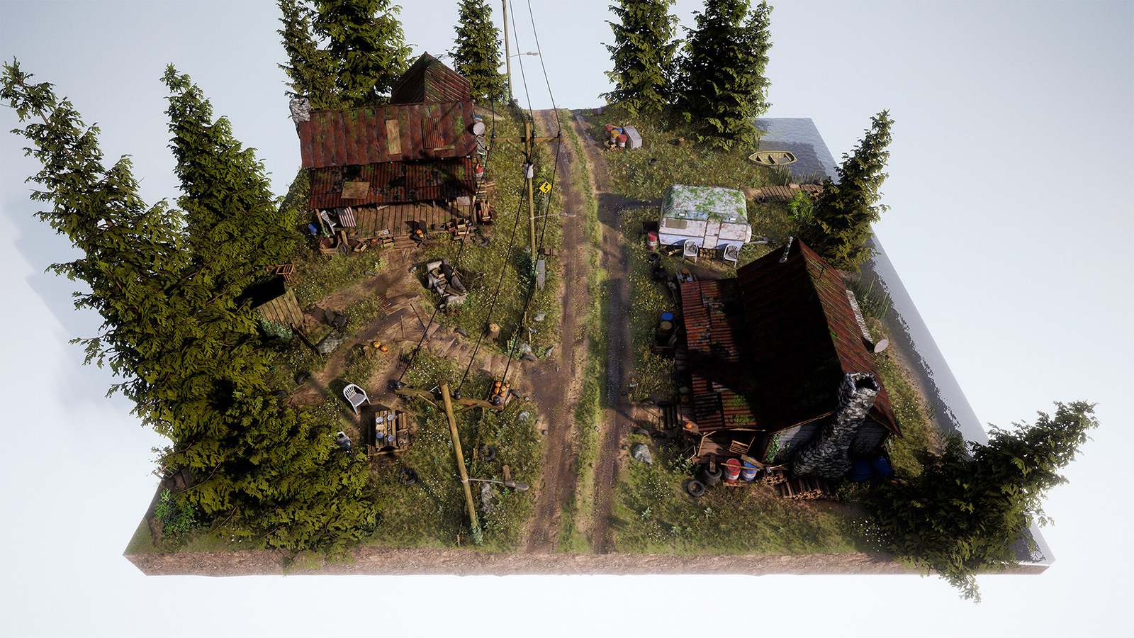 Что, на ваш взгляд, делает эту сцену живой? Мой ответ: природный рандом. Трава, растущая относительно случайно, пятна луж, рельеф дороги. Рукотворные объекты без подобных истинно живых элементов будут выбиваться, поскольку их абсолютно все довольно сложно сделать реалистичными. Да, постаравшись, вы сумеете изобразить правдоподобно какой-то один объект. Или два. Но это довольно долго. А если вам нужно набросать в сцену десяток таких объектов? Взгляните еще раз на набор этого художника для сцены. Пластиковый стул он смоделировал один, а в сцене их десять. И это не выглядит каким-то лютым повтором. Хотя на самом деле это он и есть. Аналогично с деревьями. Чтобы закрыть просветы, он дублировал в лучшем случае пару елок, а получился целый лес. Вот и нам сейчас нужно добавить в сцену немного внешних деталей. Если помните, то я обещал отправить комнатку в мир. Вот этим сейчас и займемся.