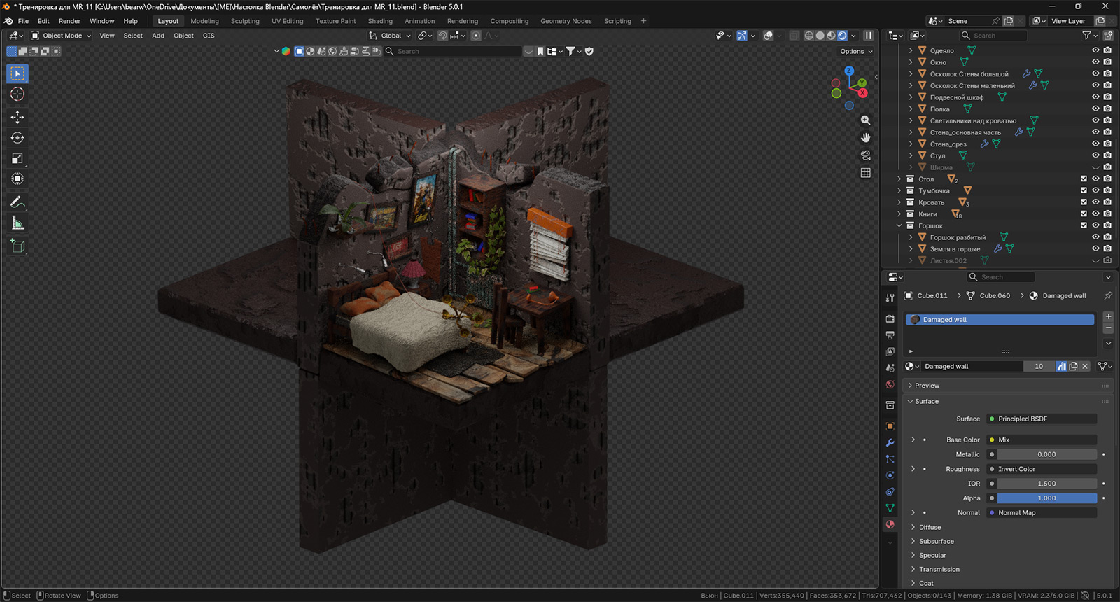 На прошлом уроке мы упомянули, что пора бы уже с комнаткой нашей закругляться. Поэтому с интерьером больше ничего делать не будем. Но вот с миром вокруг мы немного поколдуем. И именно применительно к нему в Blender возможны самые разные чудеса. Давайте для примера покажу, что собой представляет нормальный проект, который впечатляет и деталировкой, и общим наполнением сцены. Если вам попадались на глаза проекты 3D-художников, то нередко вы могли видеть среди рендеров их сцены вот такие вот наборы: