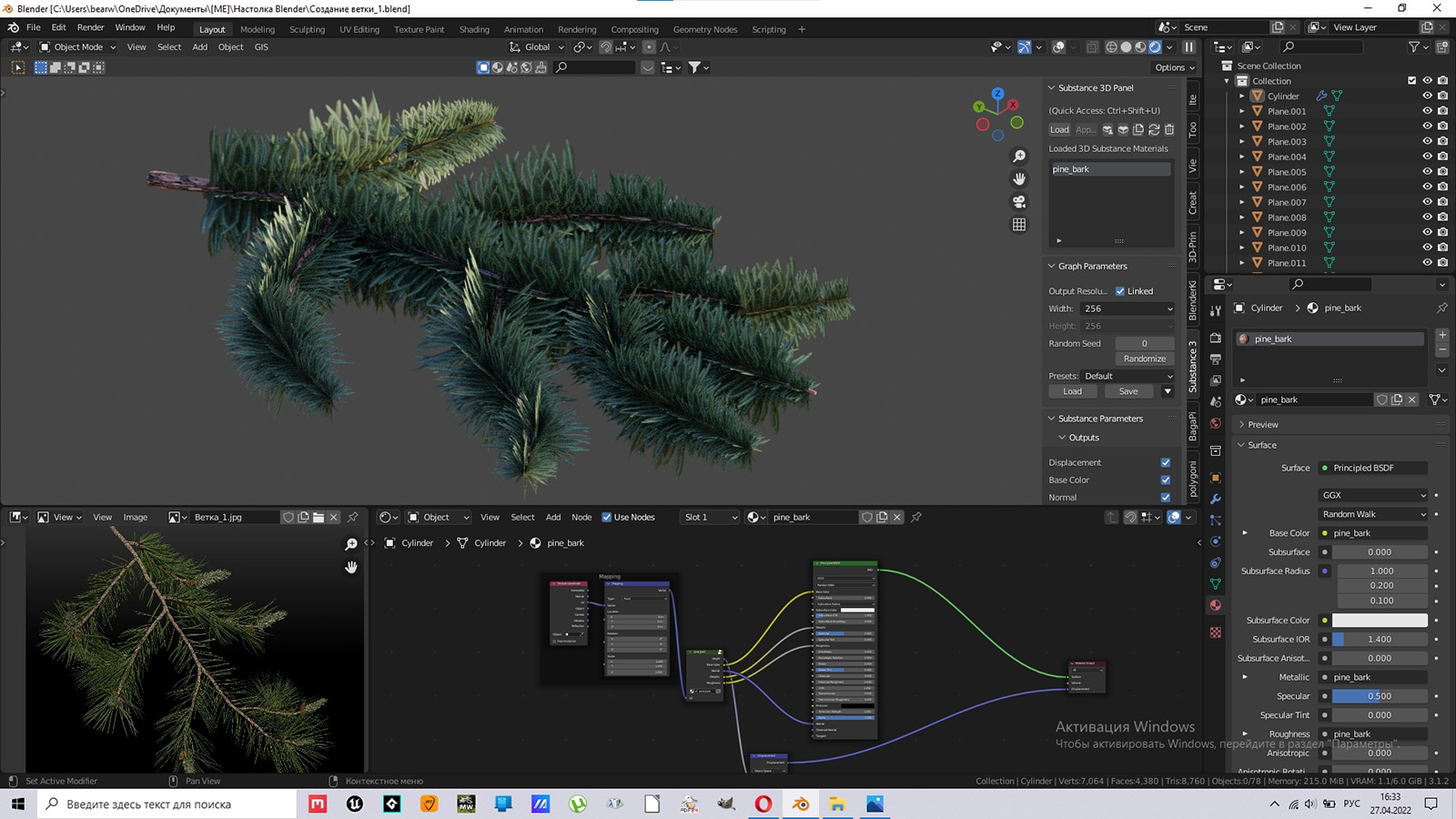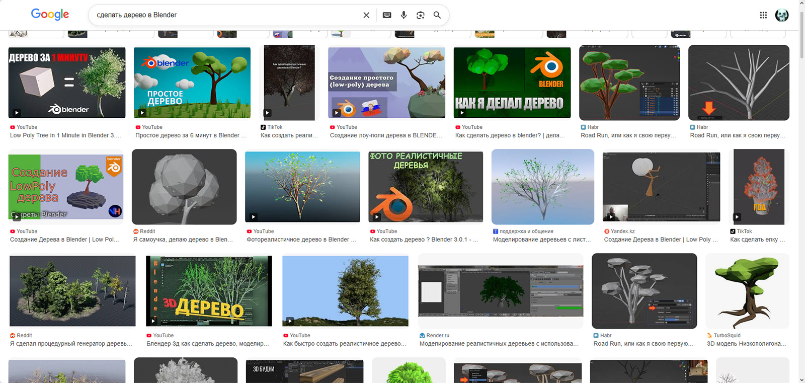 А вот здесь вас может ждать интересная проблема. Все дело в том, что вы, наверное, уже привыкли использовать готовые материалы. И кажется, чего уж проще? Взять еще один вариант материала «земля» и натянуть на получившийся рельеф. Но не все так просто. Из-за масштаба сцены у вас наверняка наступит некоторый ступор. Все потому, что вам будет казаться, что «зерна» материала или выглядят слишком крупно, или создается впечатление, что картинка повторяется слишком часто. Это происходит из-за того, что у вас пока маловато деталей на том самом рельефе. Там должны быть деревья, камни, трава. Какие-то элементы инфраструктуры и т.п. И только после этого можно спокойно примерять текстуру к поверхности рельефа. Пока же сильно на ней внимание не заостряйте. Давайте лучше немного поговорим про деревья. С ними тоже не все так просто, даже если есть возможность достать готовые варианты. Все потому, что использование готовых ассетов — это всегда риск нарваться на схожесть твоей работы с чьей-то еще. Я уже упоминал про свое наблюдение схожести разных игр от одной студии, где использовались одинаковые элементы окружения. Применяя сделанные кем-то меши, вы, скорее всего, однажды с этим столкнетесь. Поэтому иногда следует иметь возможность делать некоторые вещи самостоятельно. И если вбить в поисковике «сделать дерево в Blender», то вы увидите примерно следующее: