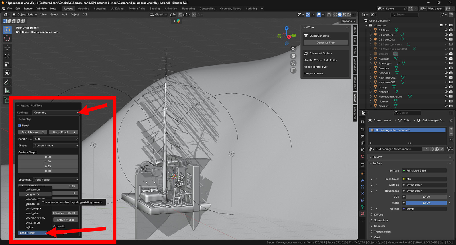 Но есть ряд сложностей. Во-первых, весьма спорное удобство редактирования геометрии. Во-вторых, после получения искомого растения перед вами встанет задачка с назначением своей текстуры стеблям (стволом это назвать не получается), поскольку они создаются из кривых и сделать им потом вменяемую развертку не всегда бывает просто. Ну и, в-третьих, вы сами видели, что, несмотря на положение курсора, создалось дерево в изначальном центре мира, что тоже не сказать, что удобно. В инструменте есть пресеты деревьев, но они, мягко говоря, весьма своеобразные.