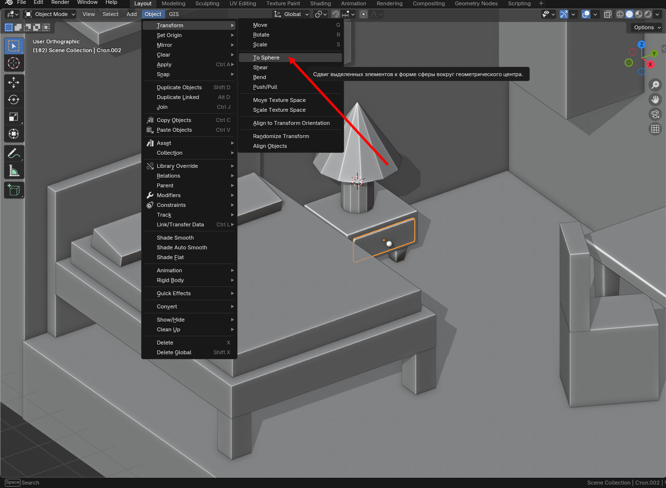 Мы уже ранее проводили подобную процедуру. Нам нужно было добавить петли в геометрию объекта с помощью операции Loop Cut. Но, как мы помним из прошлых уроков, добавлять петли можно только на те грани, которые содержат четыре вершины. Соответственно, нам требуется сначала привести объект к геометрии из четырех вершин, а только потом делить его петлями. В данном случае нам это было нужно, чтобы узнать о существовании еще двух функций. Первая — это фаска для вершин. Ее можно активировать с помощью сочетания Ctrl + Shift + клавиша с английской буквой B. Запомнить удобно. Для ребер Ctrl + B, а для вершин — Ctrl + Shift + B. Действие колесика мыши такое же. Далее мы удаляем центральную вершину, чтобы получилось отверстие. А потом применяем еще одну функцию. Она работает как для плоских объектов, так и для объемных и называется To Sphere. Найти в интерфейсе ее можно вот здесь:
