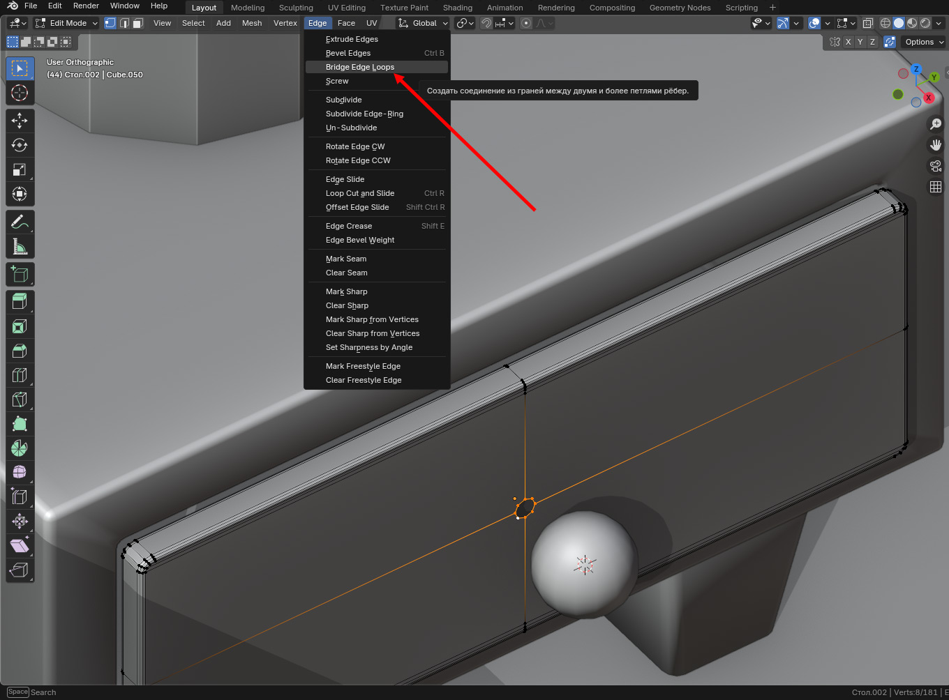 Чтобы закончить с фасадом и ручкой, изучим сегодня еще одну операцию. Она тоже будет использоваться вами очень-очень часто. Называется она Bridge Edge Loops. Она находится вот здесь: