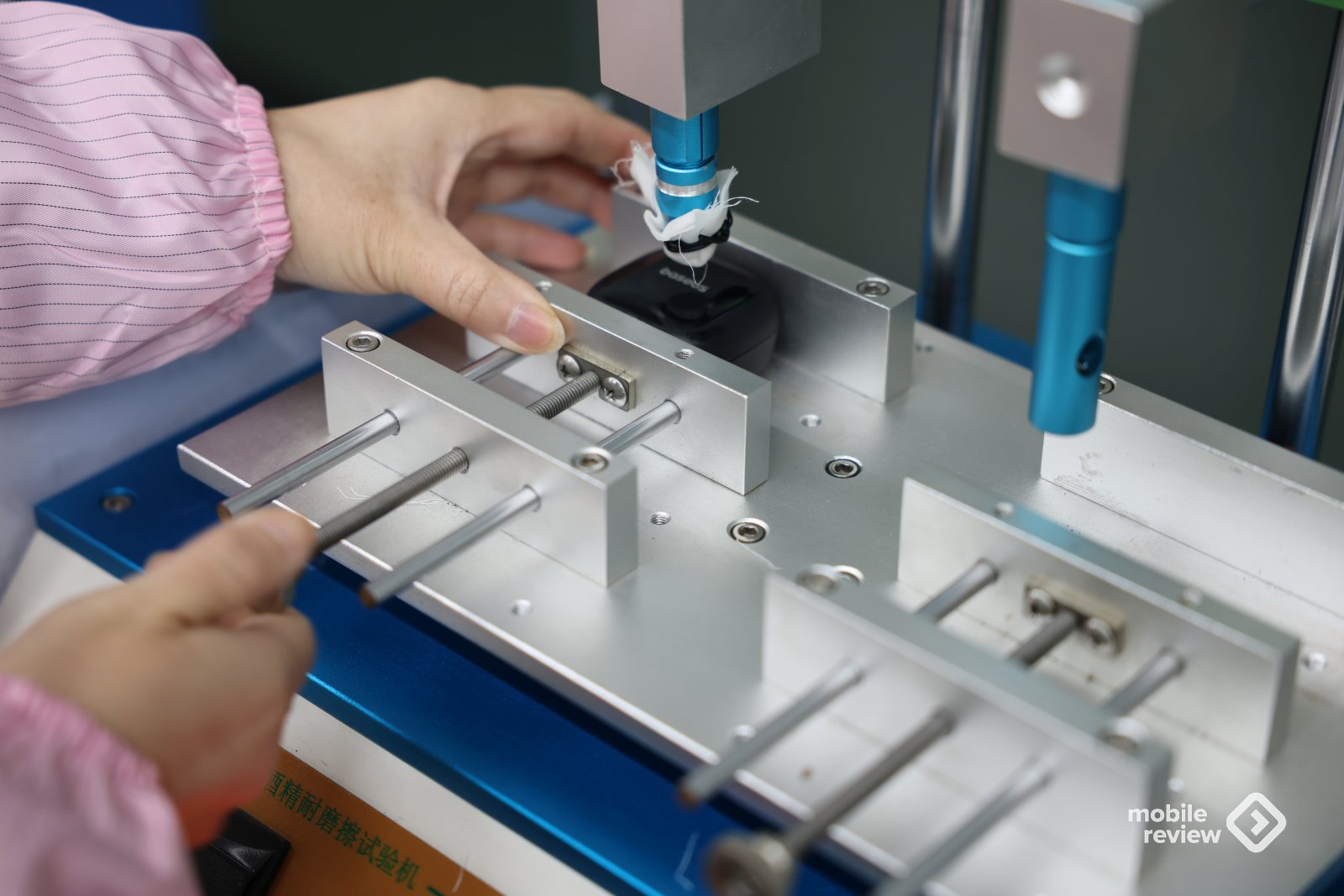 Нетрудно догадаться, что здесь происходило еще минуту назад. Автомат сдвигал лапку с мягким наконечником и пытался трением повредить надпись Baseus, нанесенную на корпус, тут проверяют качество покрытия. После десяти тысяч движений на корпусе не должно быть никаких царапин, износа, краска должна быть ровно такой же. Не используется абразивный материал, задача — имитация обычной одежды. Наконечники могут быть совершенно различными, имитируют разные виды тканей, одна из самых популярных — это джинсовая ткань (но у нас ее не было на виду).