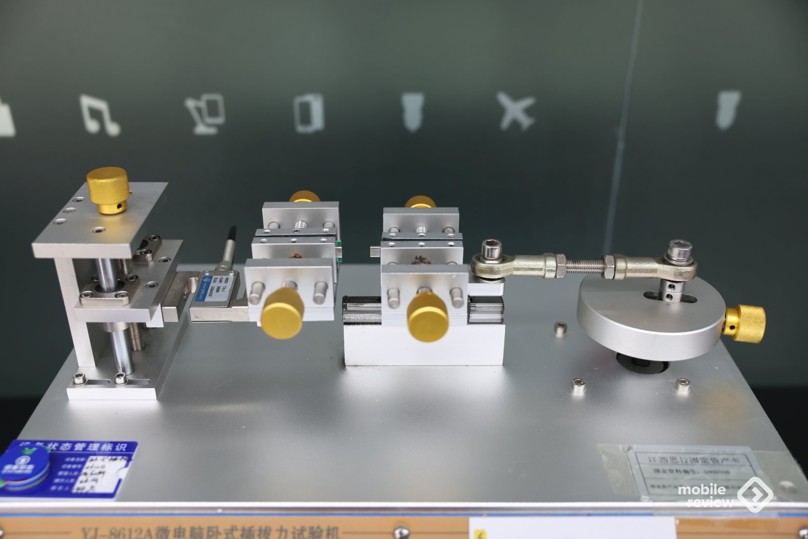 На этой машине тестируют количество циклов для разъема (вставил/вынул). Минимальное число, которое должен выдержать разъем, — от 40 000 циклов, но реальное обычно превышает 100 000 циклов. В жизни такие величины никогда не достижимы, но именно на них ориентируется фабрика.