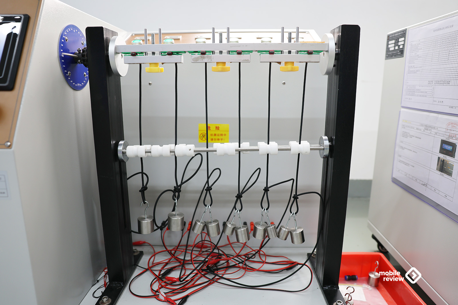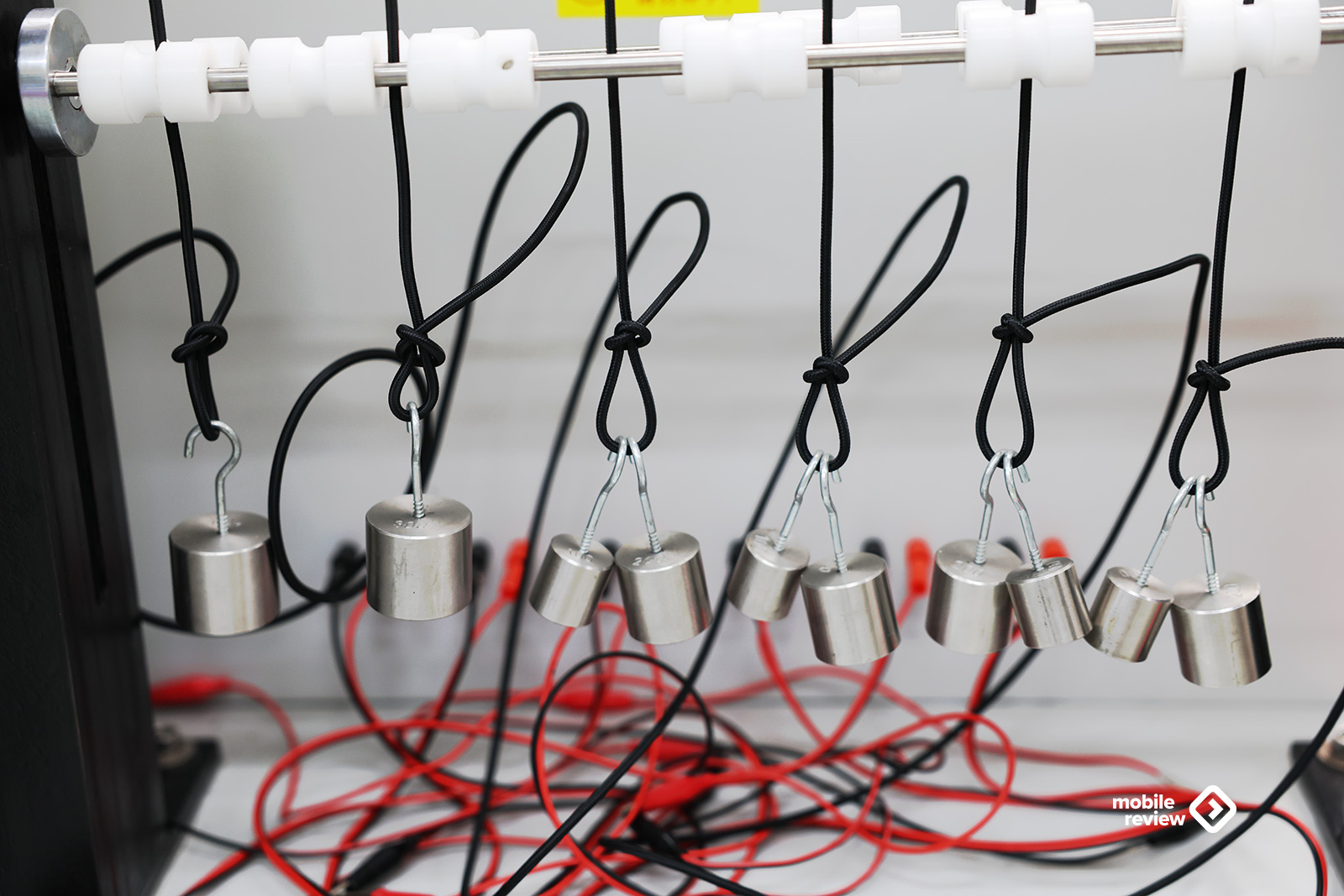 Мне нравится машина, где на кабели подвешивают грузик и дальше тянут вверх, это имитация того, как вы можете потянуть кабель из разъема. Он должен сохранить свои характеристики, не увеличиться в длине (порваться он не может).