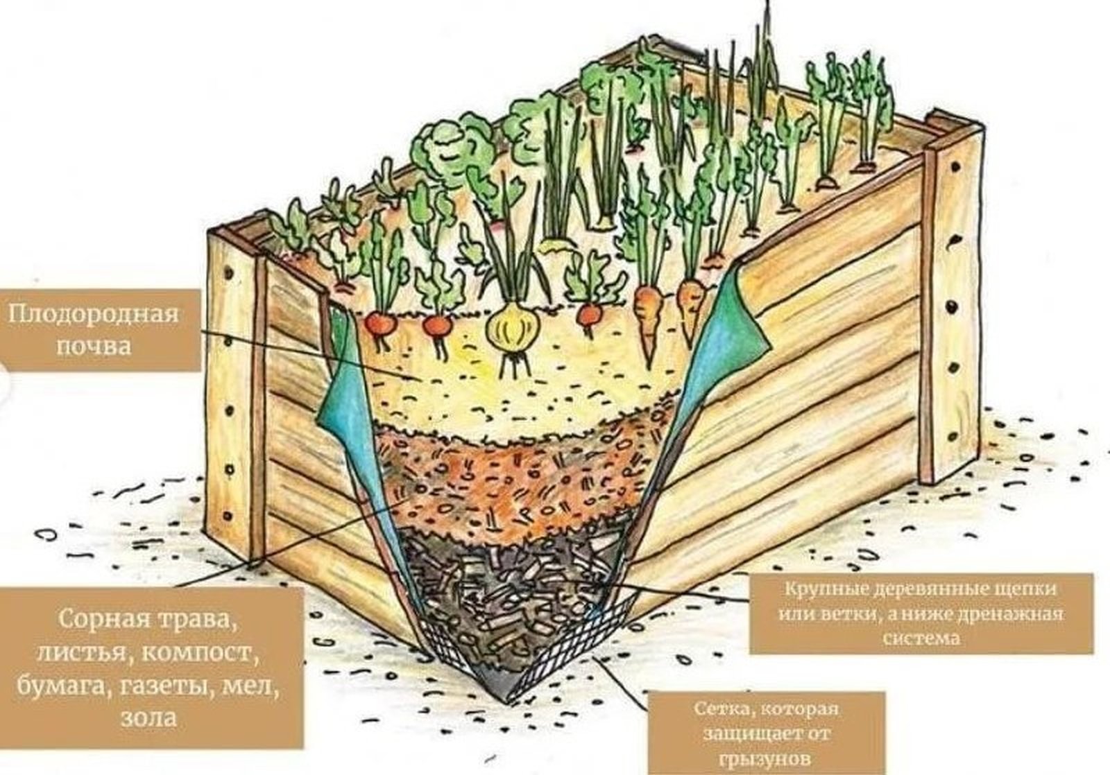 Как правило, это грядка, которая поднята от уровня земли на высоту от 20 до 100 см. При этом она может быть углублена в грунт до 60-70 см. Да, звучит трудоемко, но это еще не все, грядку надо правильно заложить.
