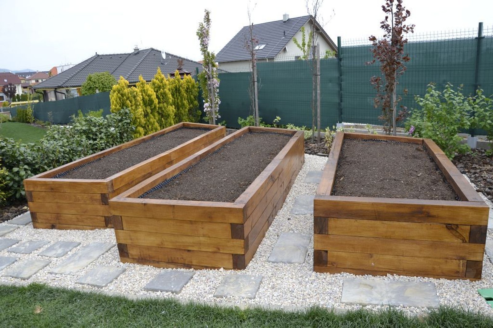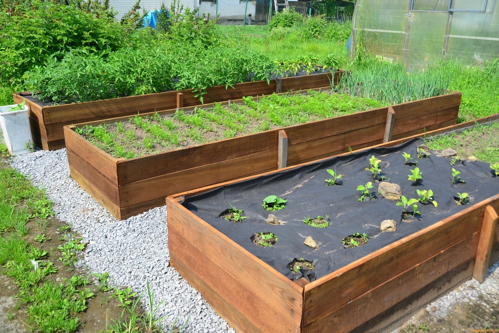 Такие грядки выглядят эстетично, но требуют очень серьезной подготовки дерева ‒ шлифовка, неоднократная пропитка, прокладка между деревом и почвой непроницаемой пленки (на фото видно краешки такой пленки) и все равно ‒ даже замоченный в антисептике брус 10×10 см потеряет товарный вид и однажды все равно сгниет. Если дерево не растет из земли ‒ земля ему не очень нравится.